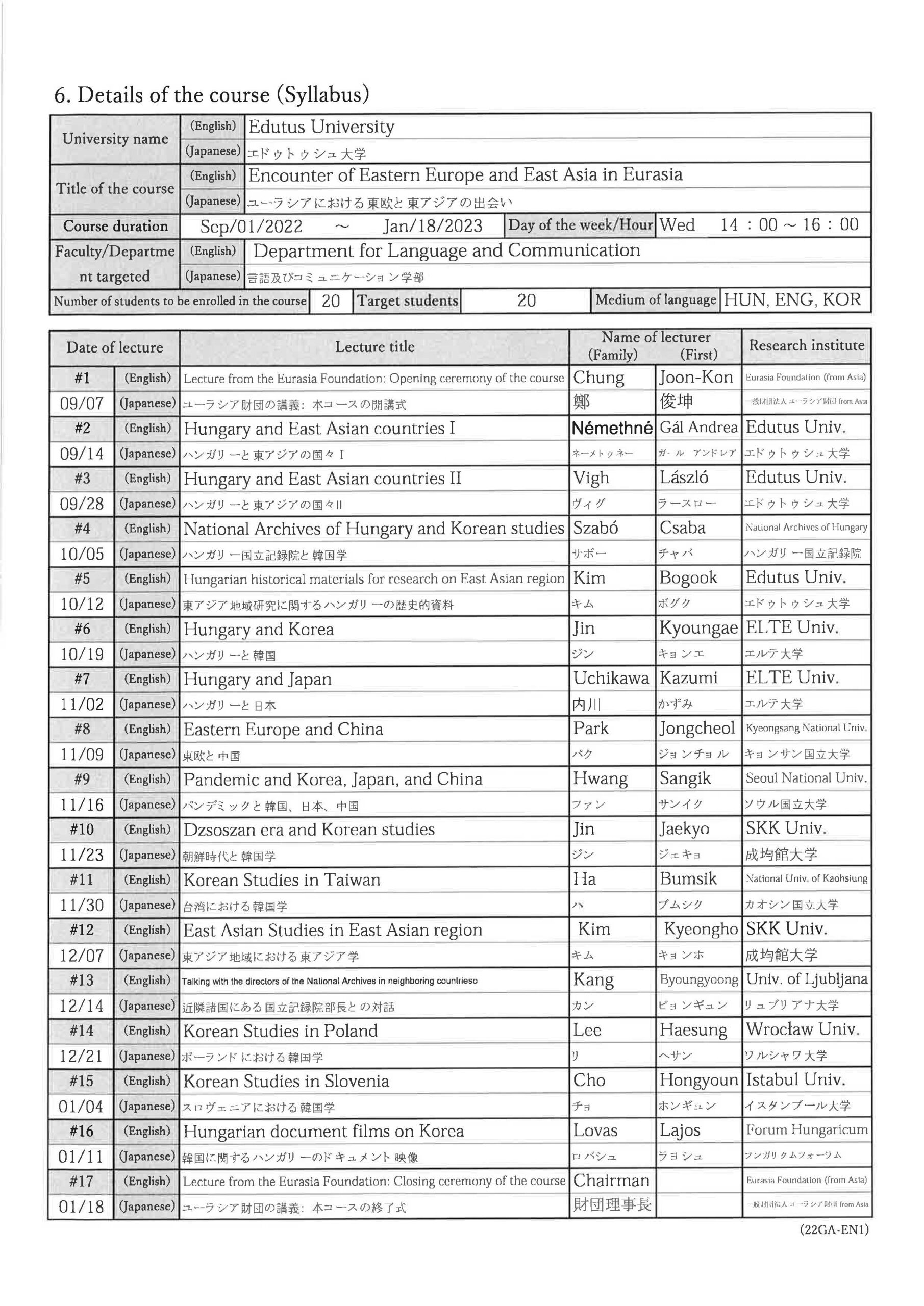 初年度 2022年9月~2023年1月 ユーラシアにおける東欧と東アジアの出会い 2年目 2023年9月~2023年12月 ユーラシアにおける東欧と東アジアの出会い 3年目 2024年9月~2024年12月 ユーラシアにおける東欧と東アジアの出会い 4年目 2025年9月~2025年12月 ユーラシアにおける東欧と東アジアの出会い - ペーチ大学(ペーチ)