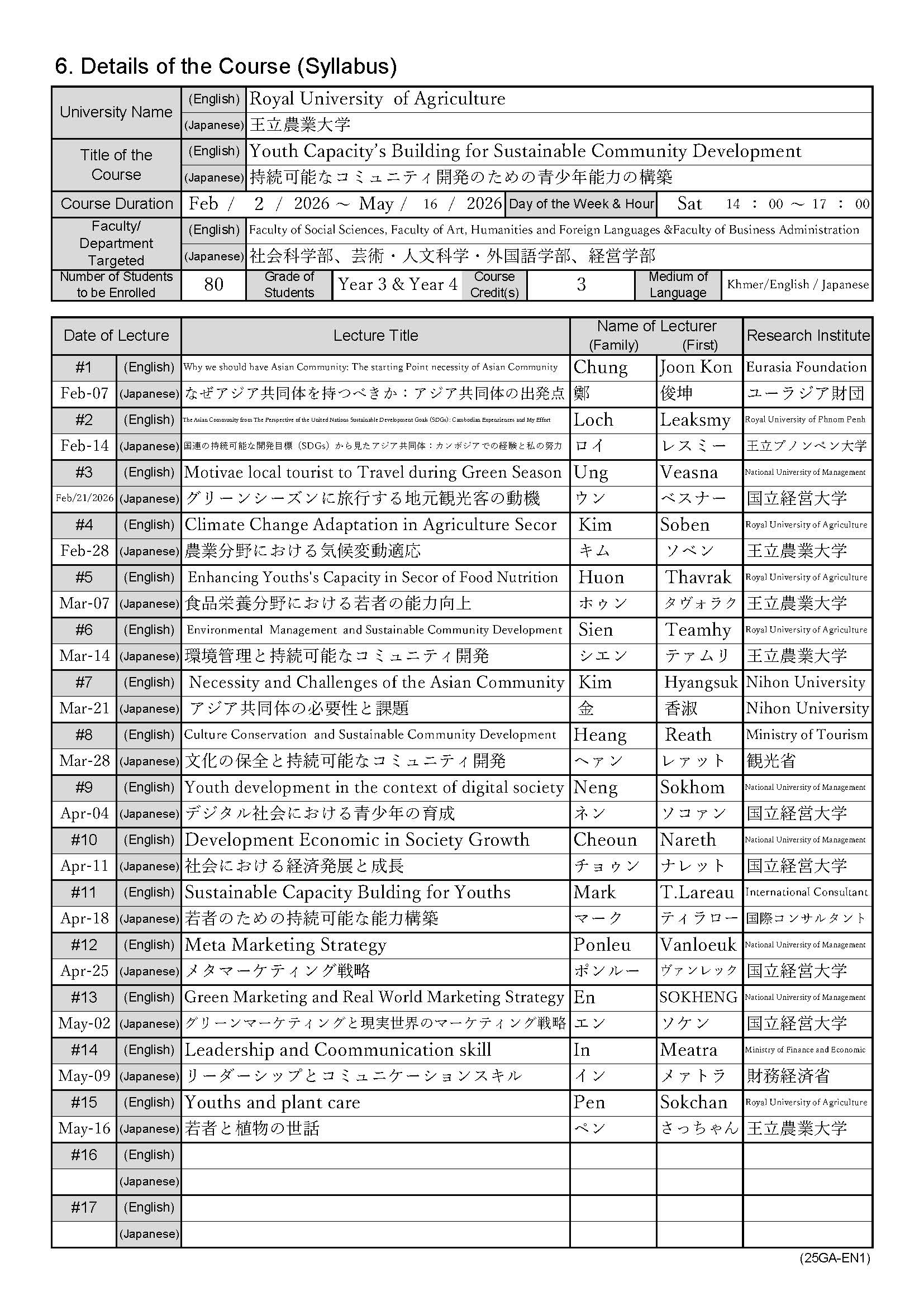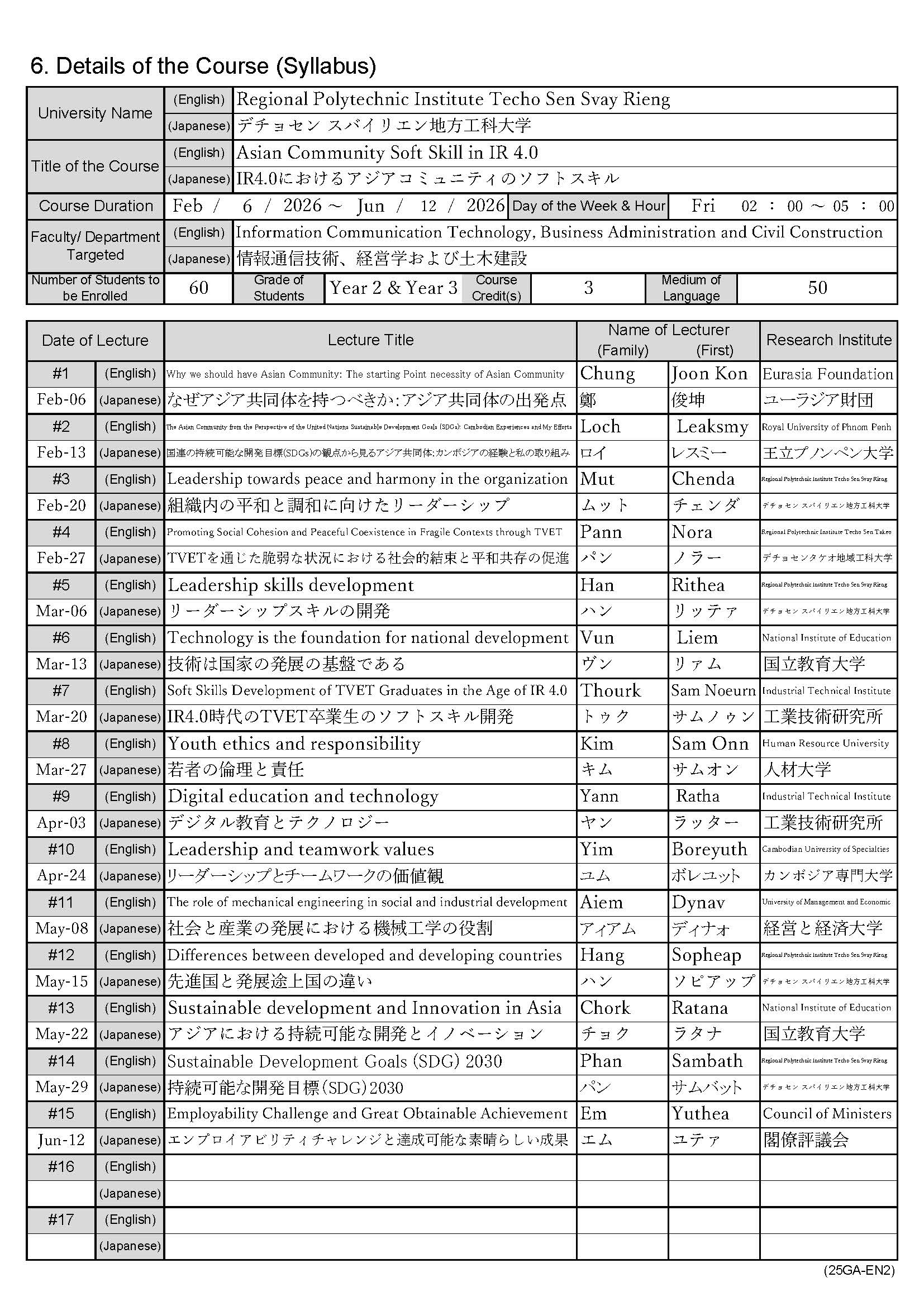 初年度 2023年11月~2024年2月 アジア共同体の平和な暮らしに向けて 2年目 2025年2月~2025年5月 アジア地域社会の平和な暮らしに向けて 3年目 2026年2月~2026年6月 IR4.0におけるアジアコミュニティのソフトスキル - カンポンスプー州工科大学(カンポンスプー)