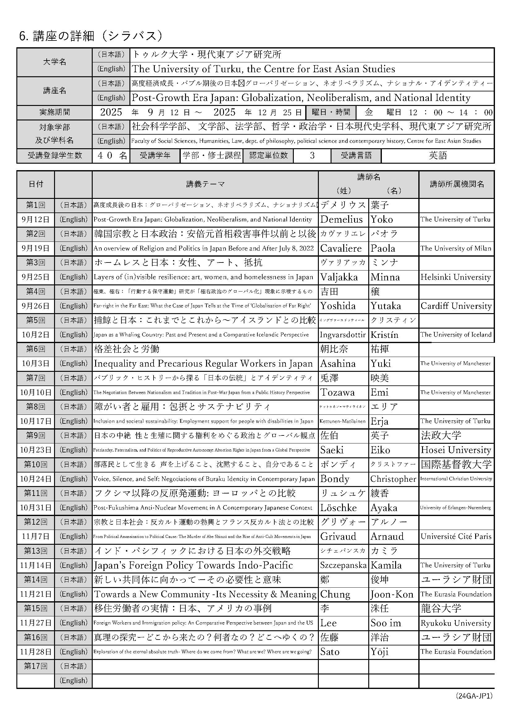 | 初年度 | 2025年9月~2025年11月 | グローバリゼーション、ネオリベラリズム、ナショナル・アイデンティティ:高度経済成長・バブル期後の日本 |