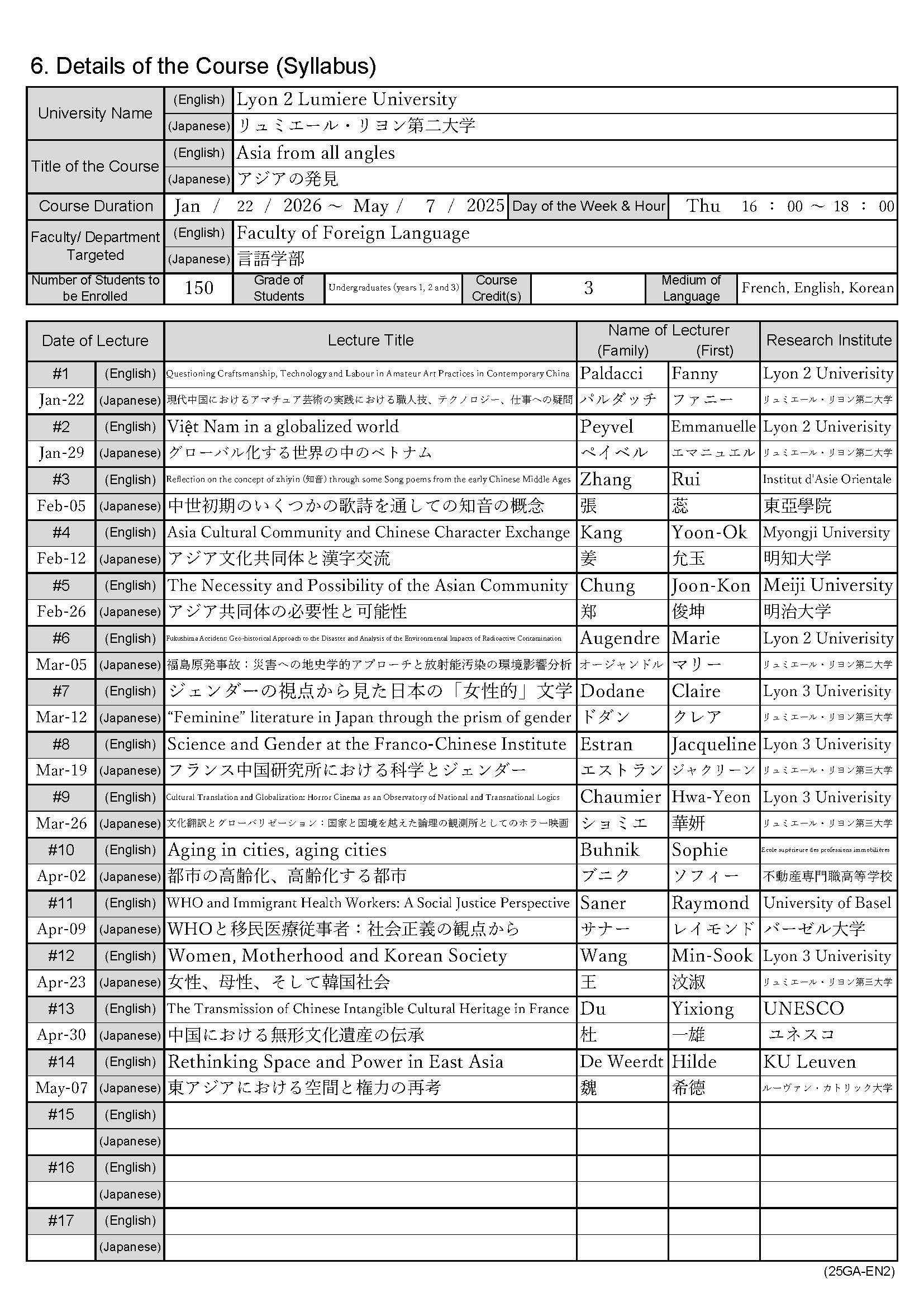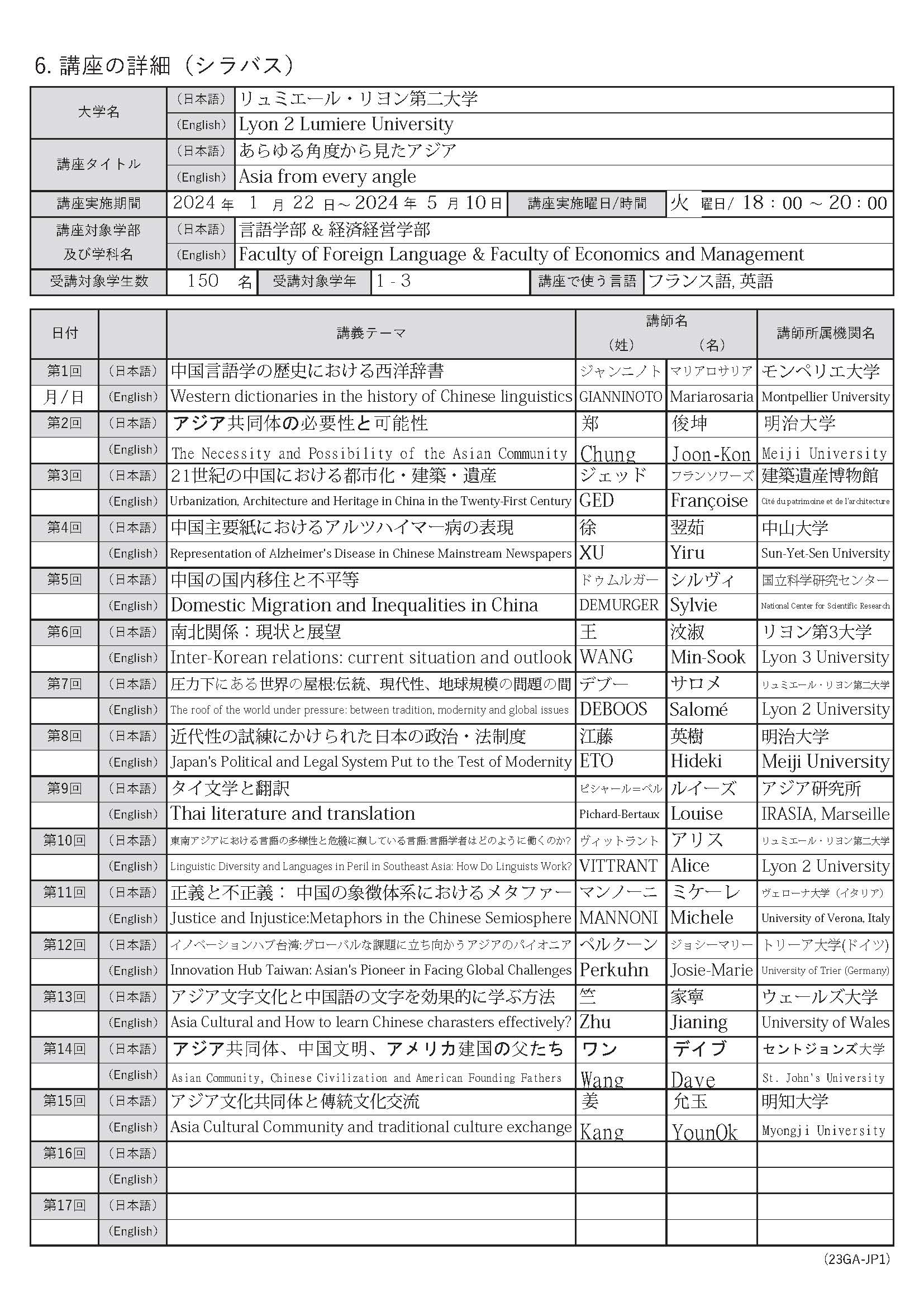 初年度 2022年9月~2023年1月 アジア社会:継続と変化 2年目 2024年1月~2024年5月 あらゆる角度から見たアジア 3年目 2025年2月~2025年4月 あらゆる角度から見たアジア 4年目 2026年1月~2026年5月 あらゆる角度から見たアジア