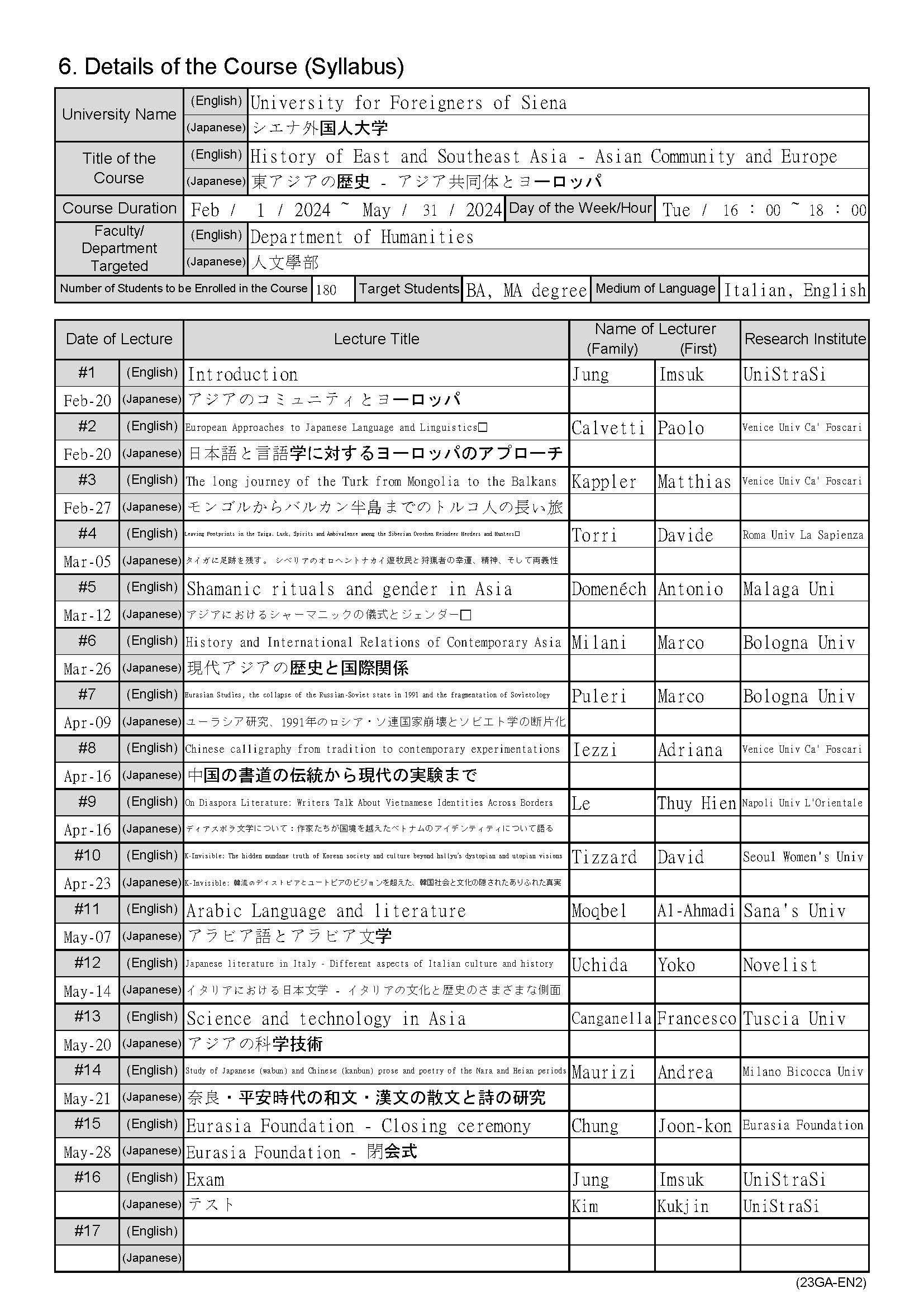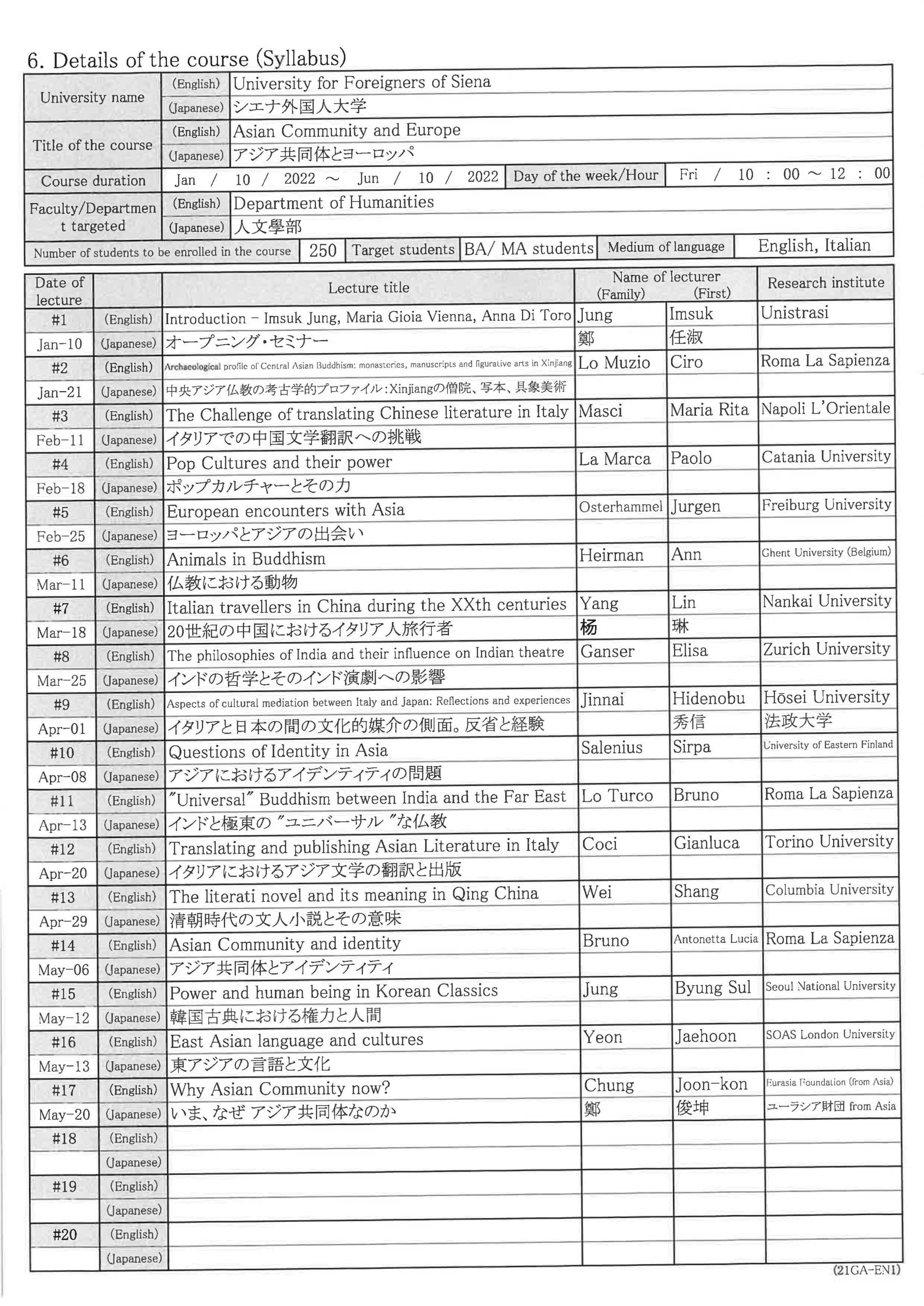 初年度 2020年10月~2021年4月 アジア共同体とヨーロッパ 2年目 2022年1月~2022年6月 アジア共同体とヨーロッパ 3年目 2023年3月~2023年5月 東アジアの歴史-アジア共同体とヨーロッパ 4年目 2024年2月~2024年5月 東アジアの歴史-アジア共同体とヨーロッパ 5年目 2025年2月~2025年5月 東アジアの歴史:アジア共同体とヨーロッパ - ヴェネツィア・カフォスカリ大学(ヴェネツィア)