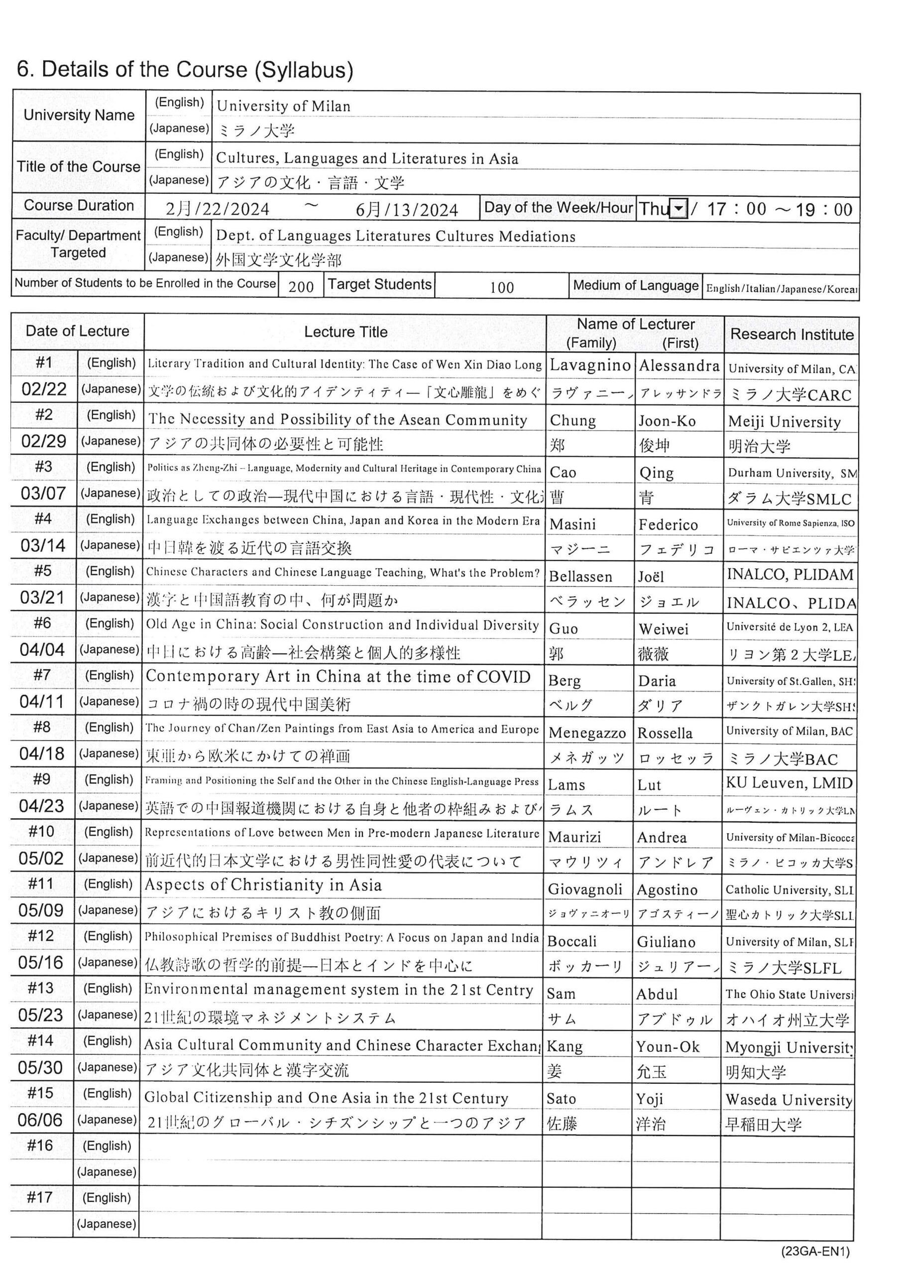 初年度 2024年2月~2024年6月 アジアの文化・言語・文学 - ベルガモ大学(ベルガモ)