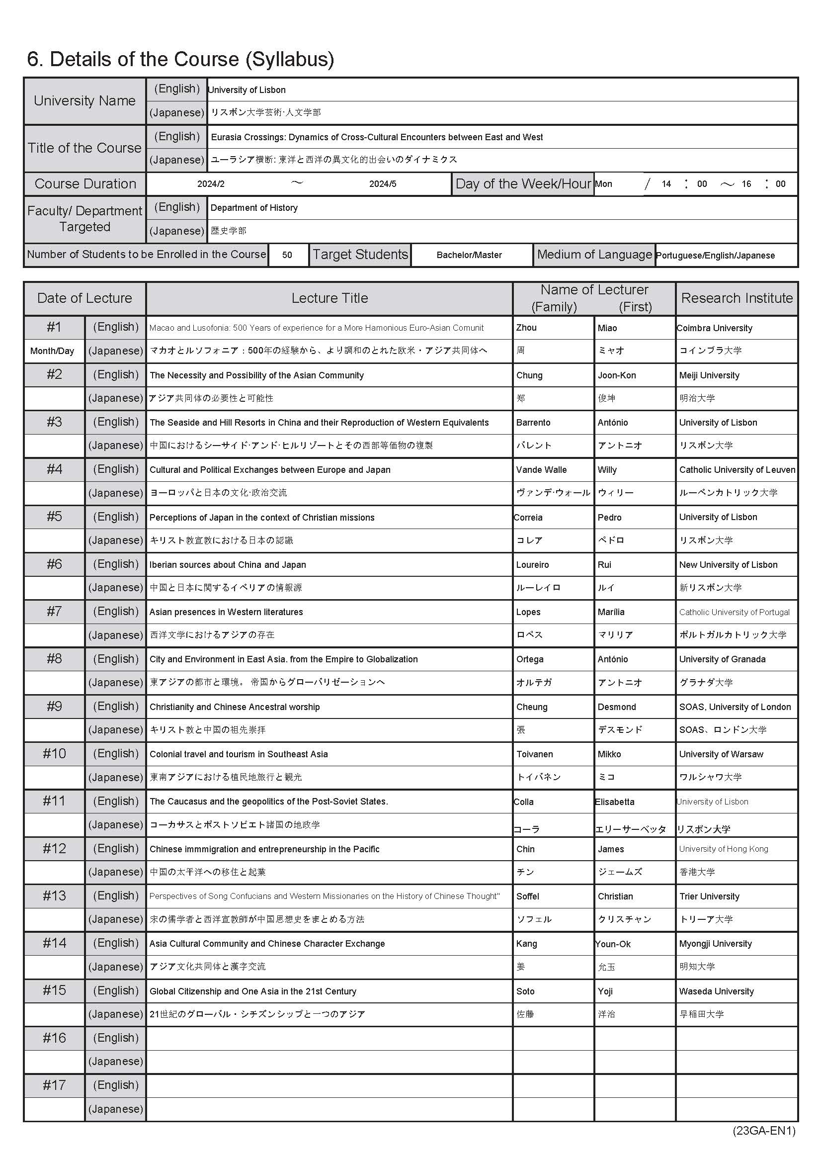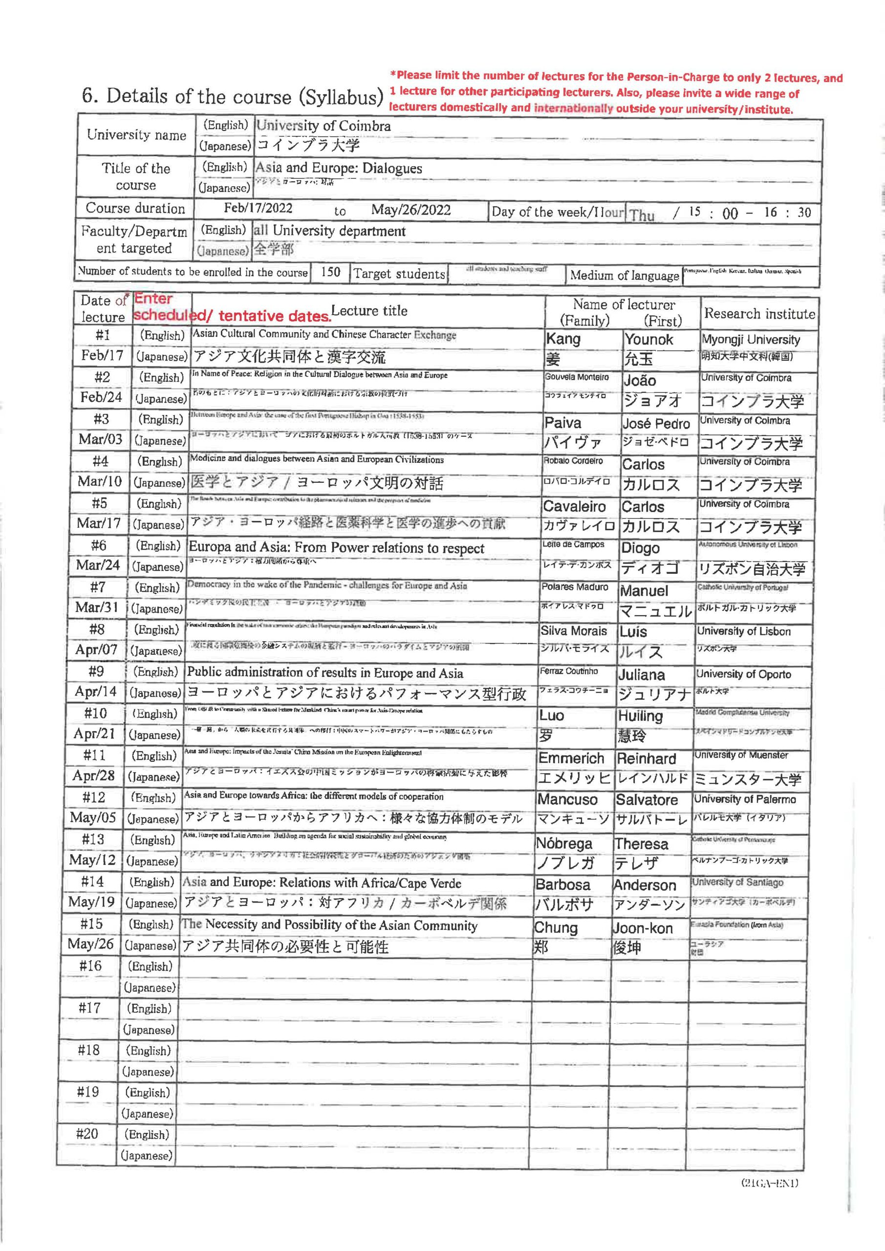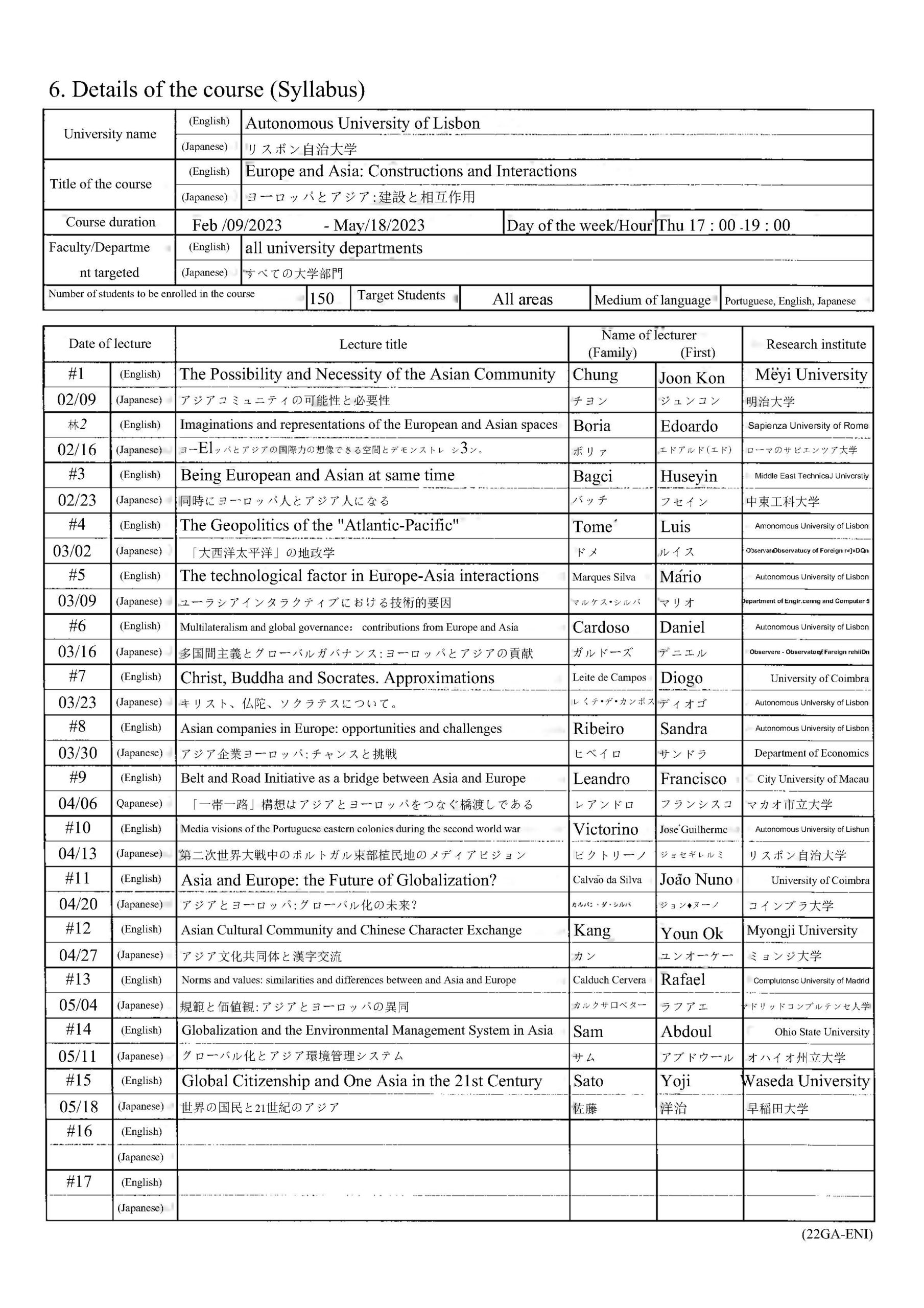 初年度 2021年2月~2021年5月 アジアとヨーロッパーポルトガル文明 2年目 2022年2月~2022年5月 アジアとヨーロッパ:対話 - リスボン自治大学(リスボン)