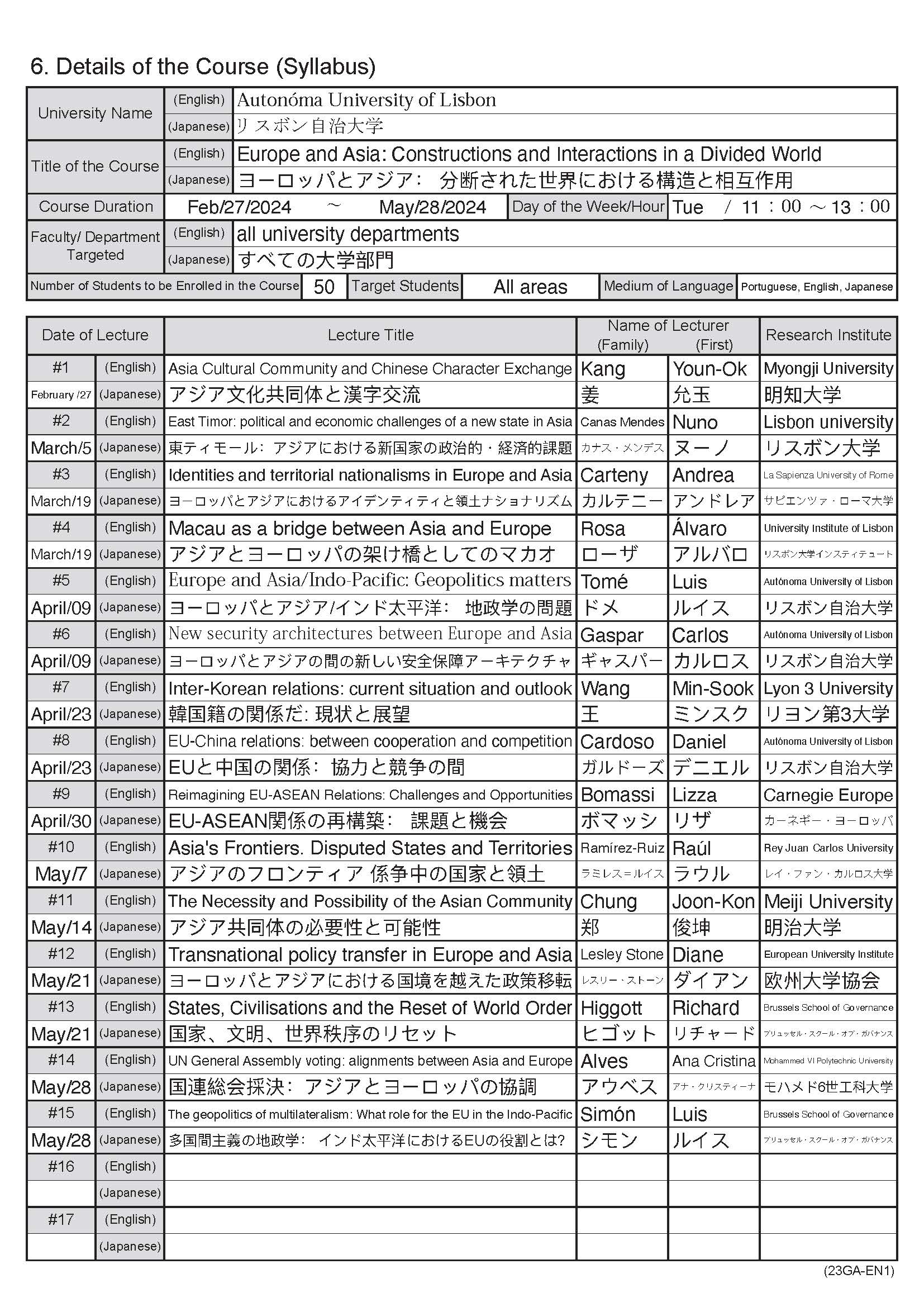 初年度 2023年2月~2023年5月 ヨーロッパとアジア:構築と相互作用 2年目 2024年2月~2024年5月 ヨーロッパとアジア:分断された世界における構造と相互作用 - リスボン大学(リスボン)