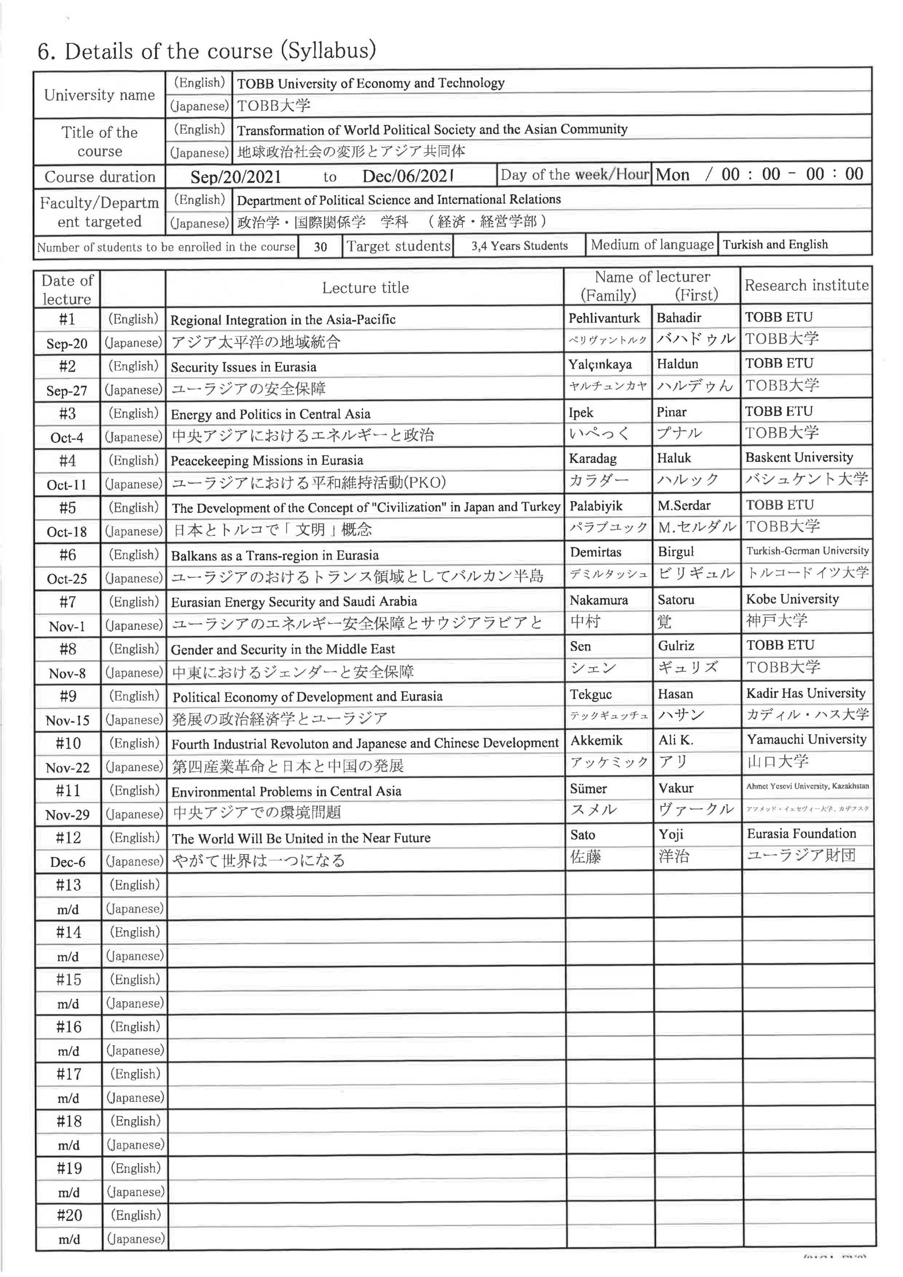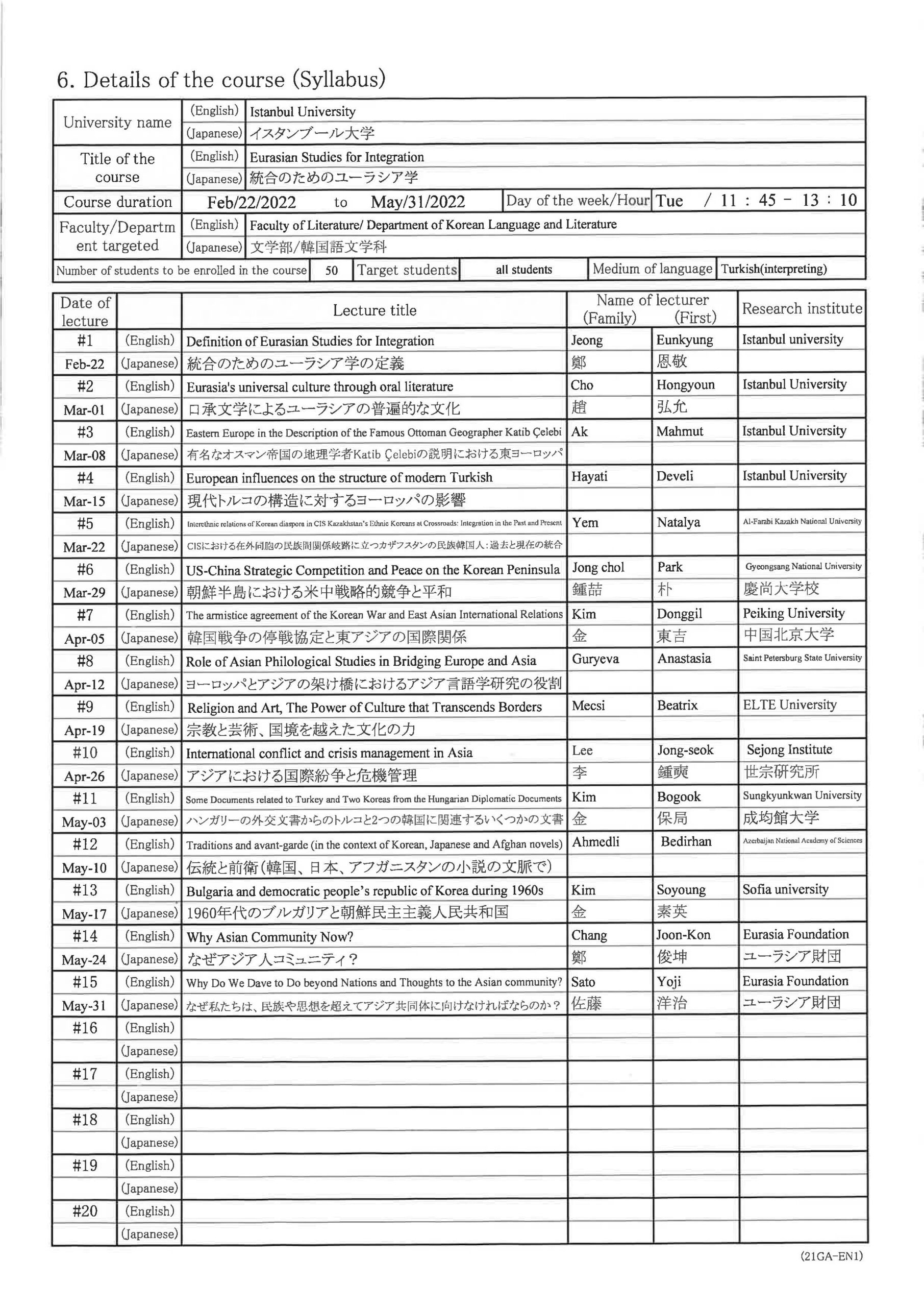 初年度 2021年2月~2021年5月 アジア共同体と東亜平和防衛 2年目 2022年2月~2022年5月 アジア共同体と東アジアの平和と安全 3年目 2023年2月~2023年5月 アジア共同体と東アジアの平和と安全 4年目 2024年9月~2024年12月 アジア共同体と東アジアの平和と安全 - イスタンブール大学(イスタンブール)