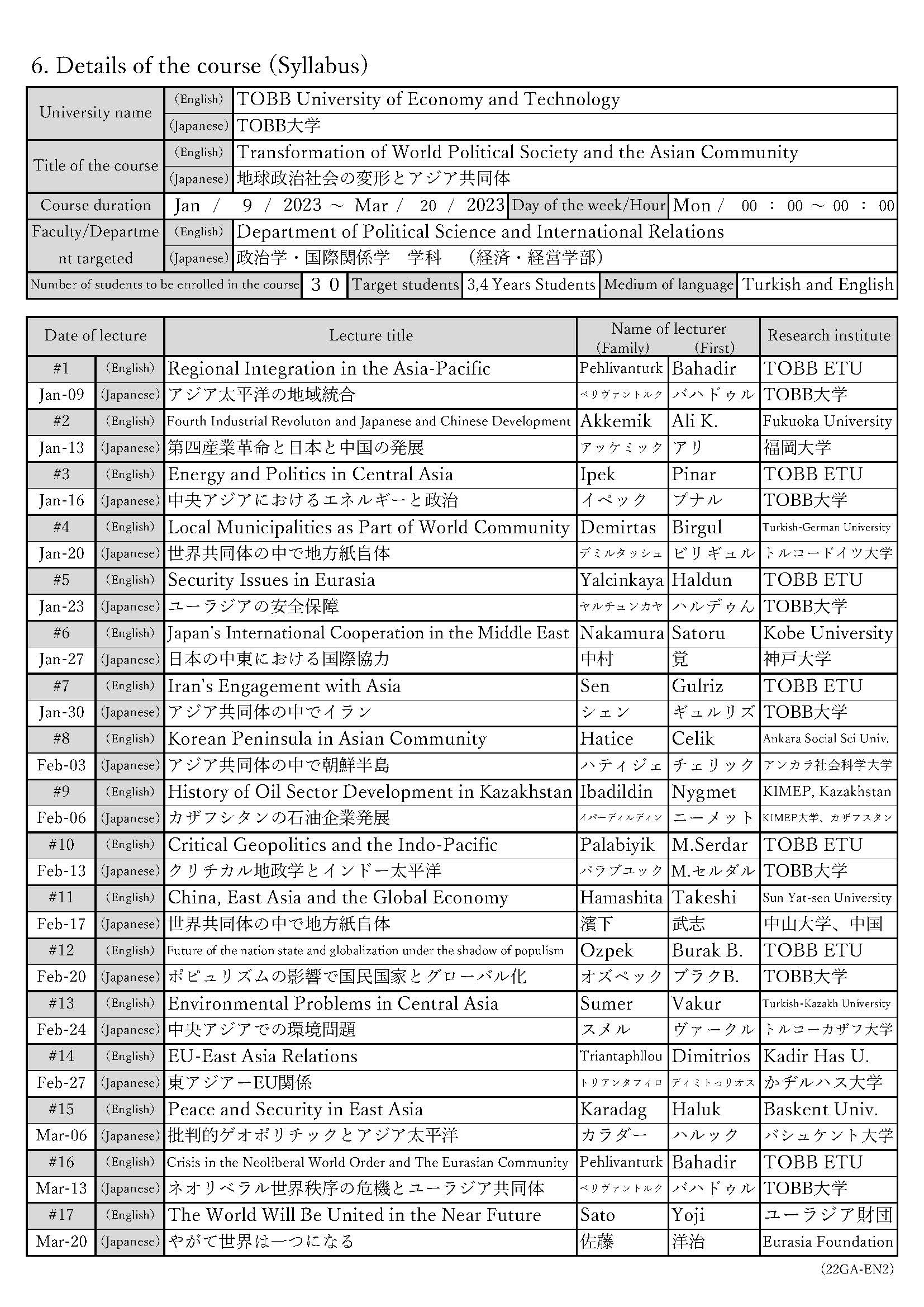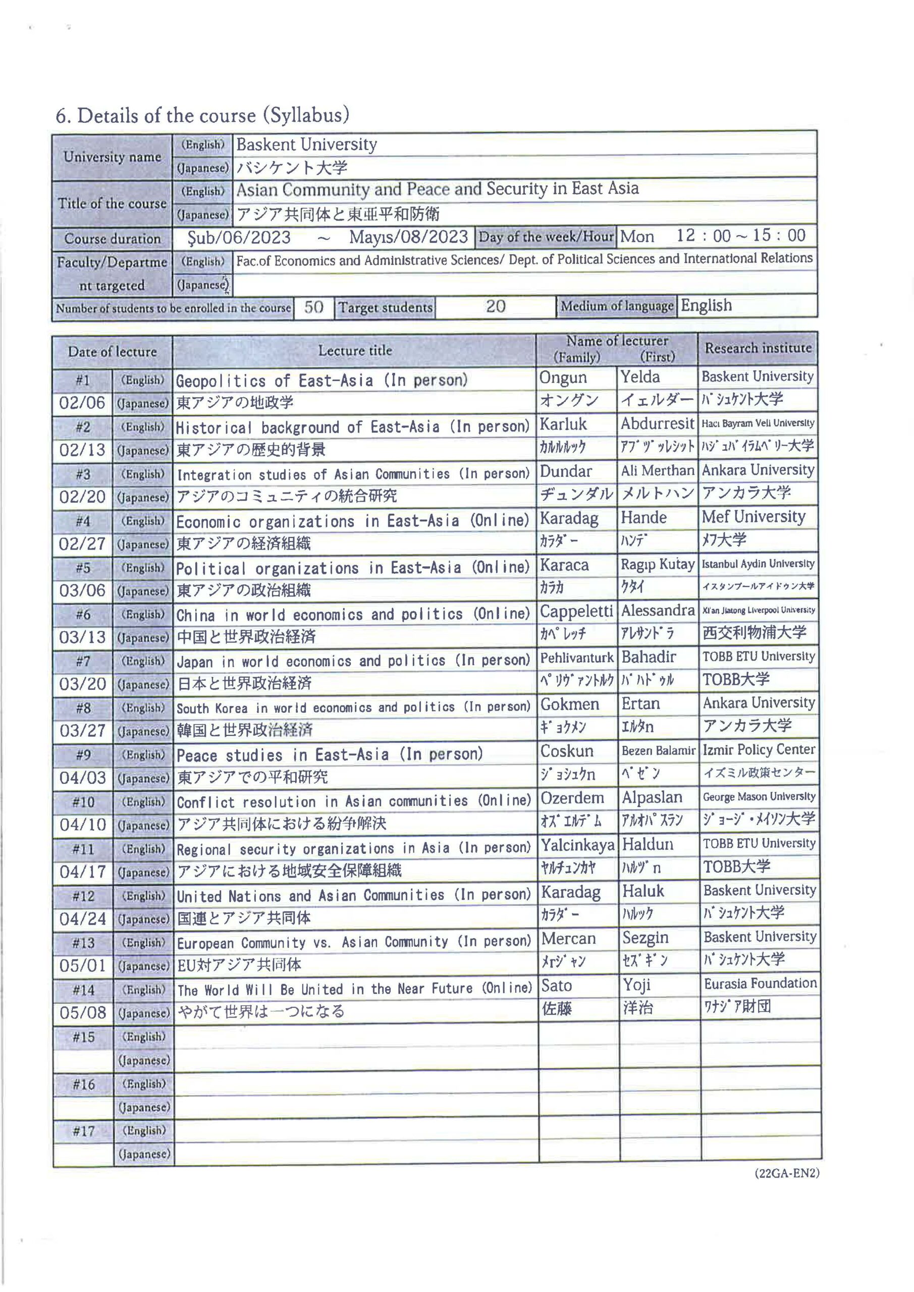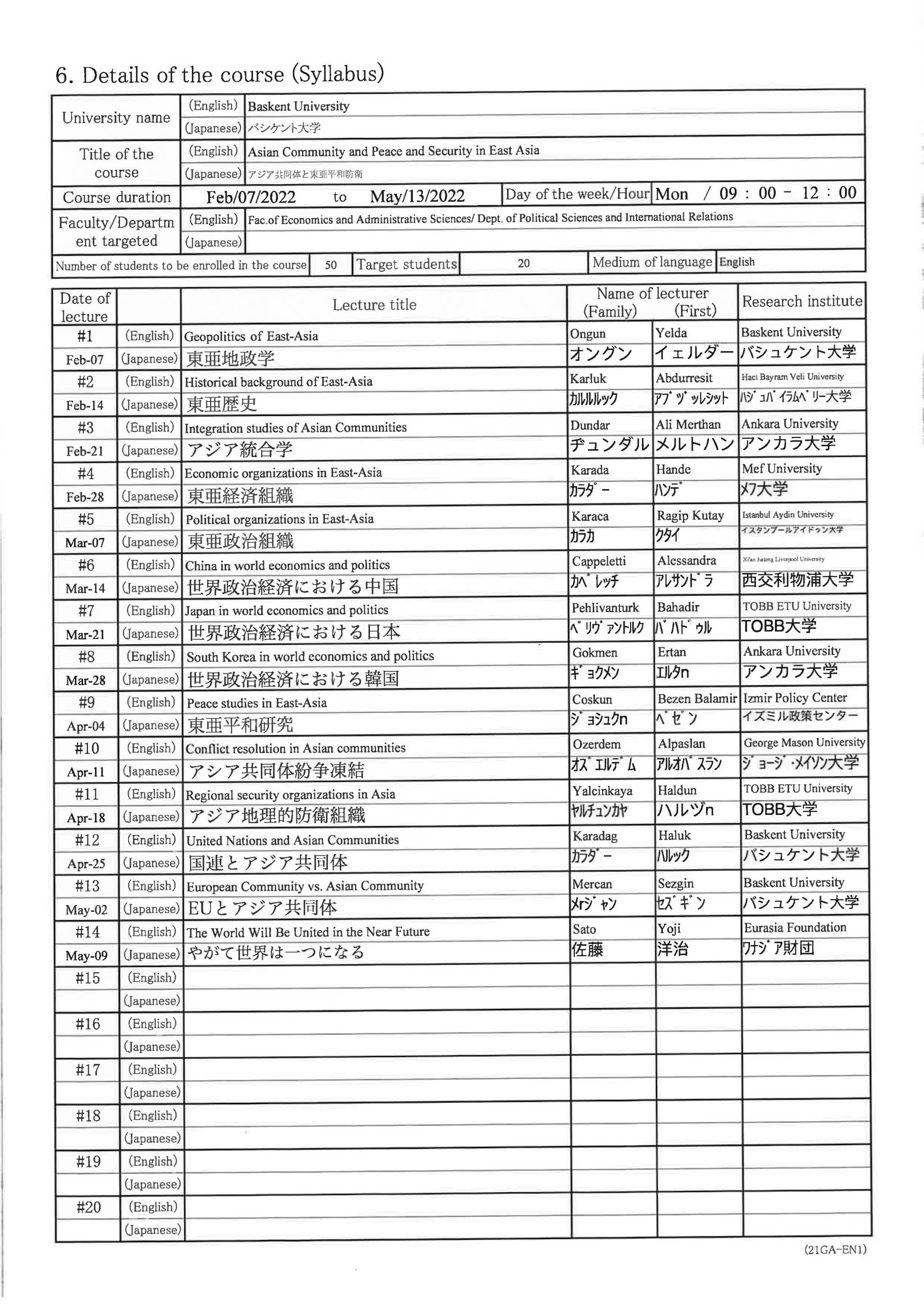 (奨学生表彰:4名)2年目 2017年2月~2017年6月 アジア共同体のビジョンと実践 3年目 2017年9月~2018年1月 アジア共同体論 4年目 2018年9月~2018年12月 アジア共同体の経済と政治 5年目 2019年9月~2019年12月 アジア共同体の経済と政治 - バシケント大学(アンカラ)