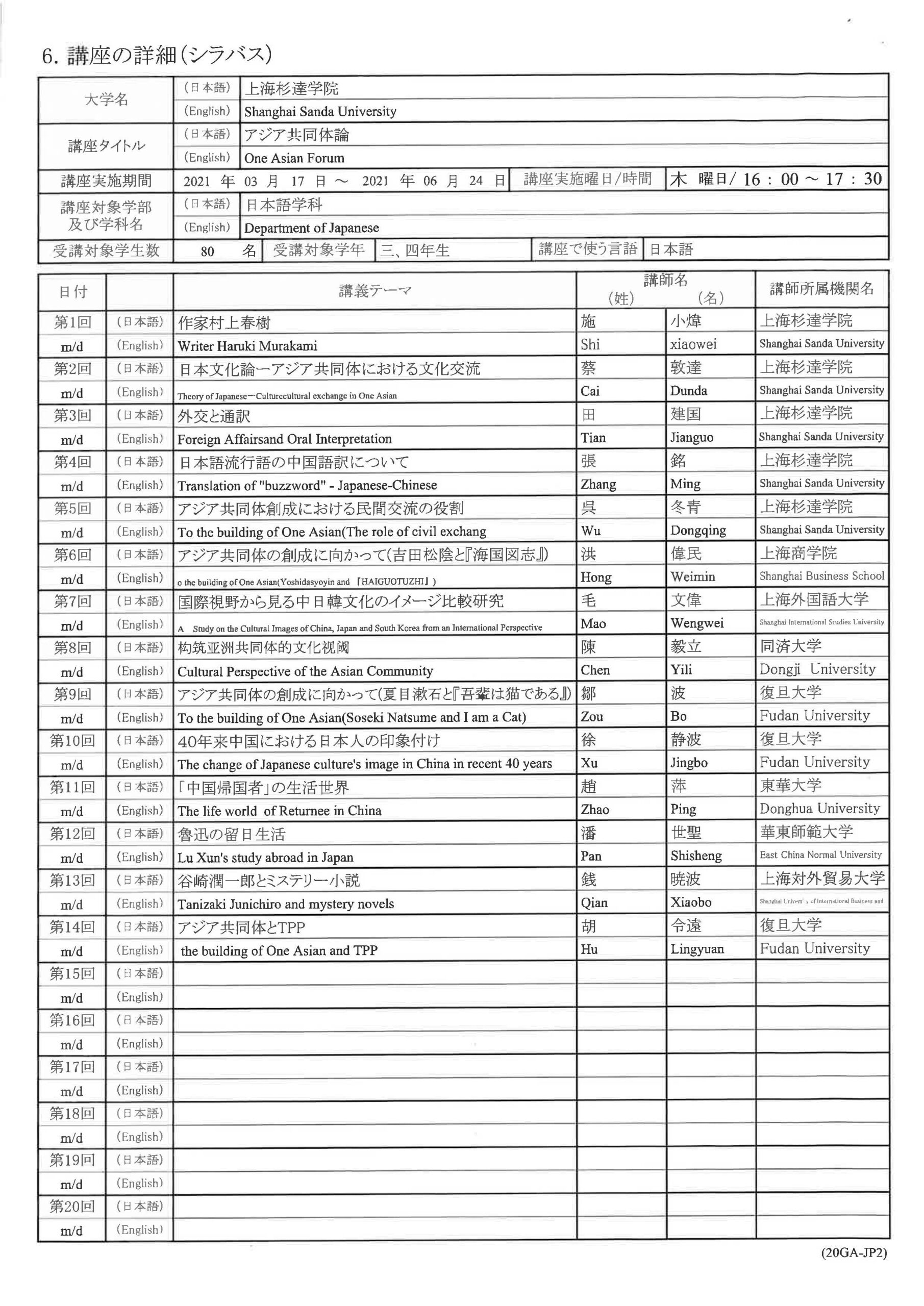 First year Dec. 2012 - May. 2013 Course on Asian Community -Its Takes and Future Perspective- Second year Mar. 2014 - Jul. 2014 Course on Asian Community -Tasks and Visions of the Community- - Shanghai Jiao Tong University(Shanghai)