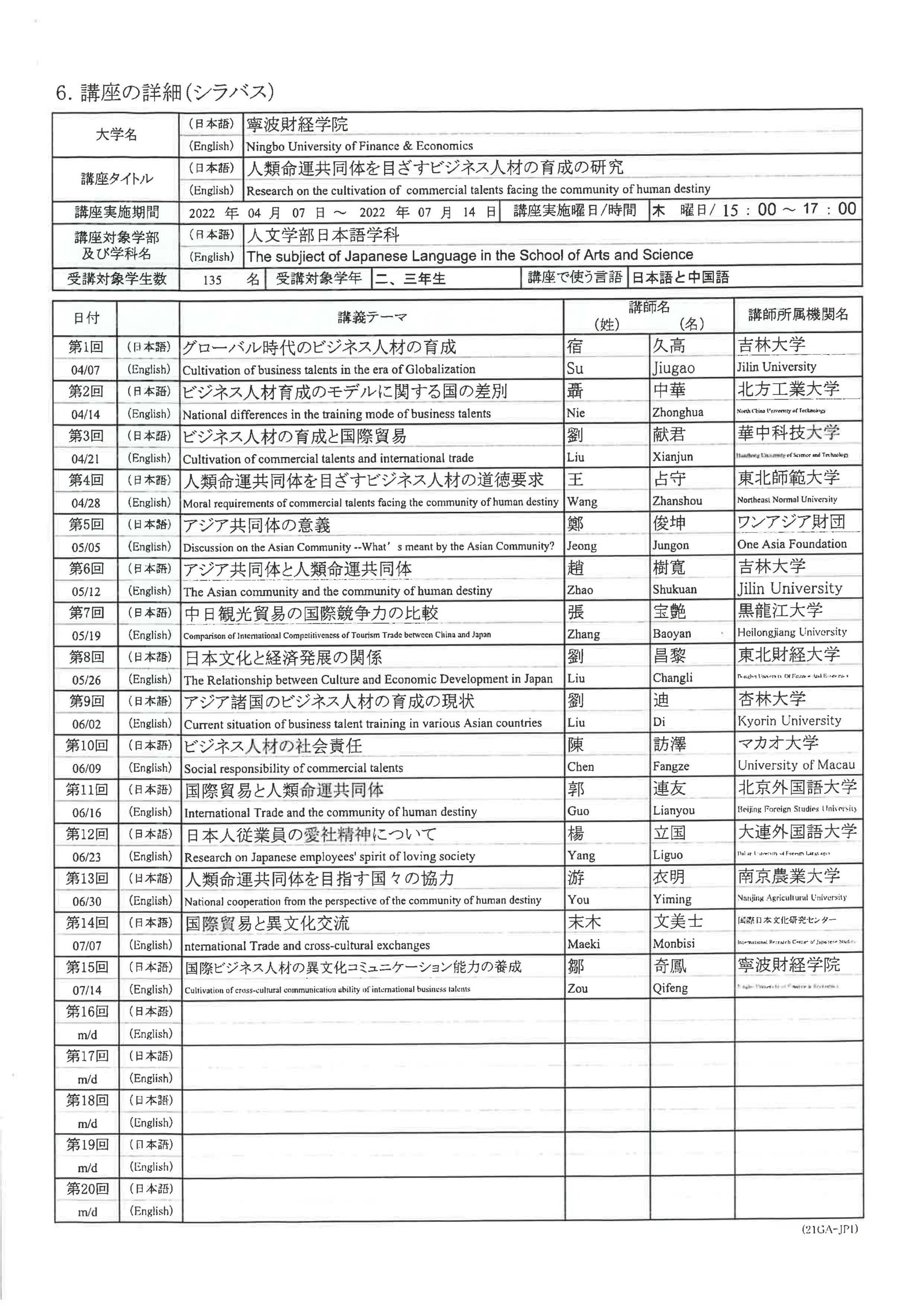 First year Mar. 2022 - Jun. 2022 Business Cultural Exchange in Asian Community Second year Feb. 2023 - Apr. 2023 Cultural Exchange in Asian Community Third year Feb. 2024 - Jun. 2024 Cultural Continuity and Exchange in the Asian Community Fourth year Jan. 2025 - Apr. 2025 Cultural Continuity and Exchange in the Asian Community Fifth year Jan. 2026 - May. 2026 Cultural Continuity and Exchange in the Asian Community - Ningbo University of Finance & Economics(Ningbo)