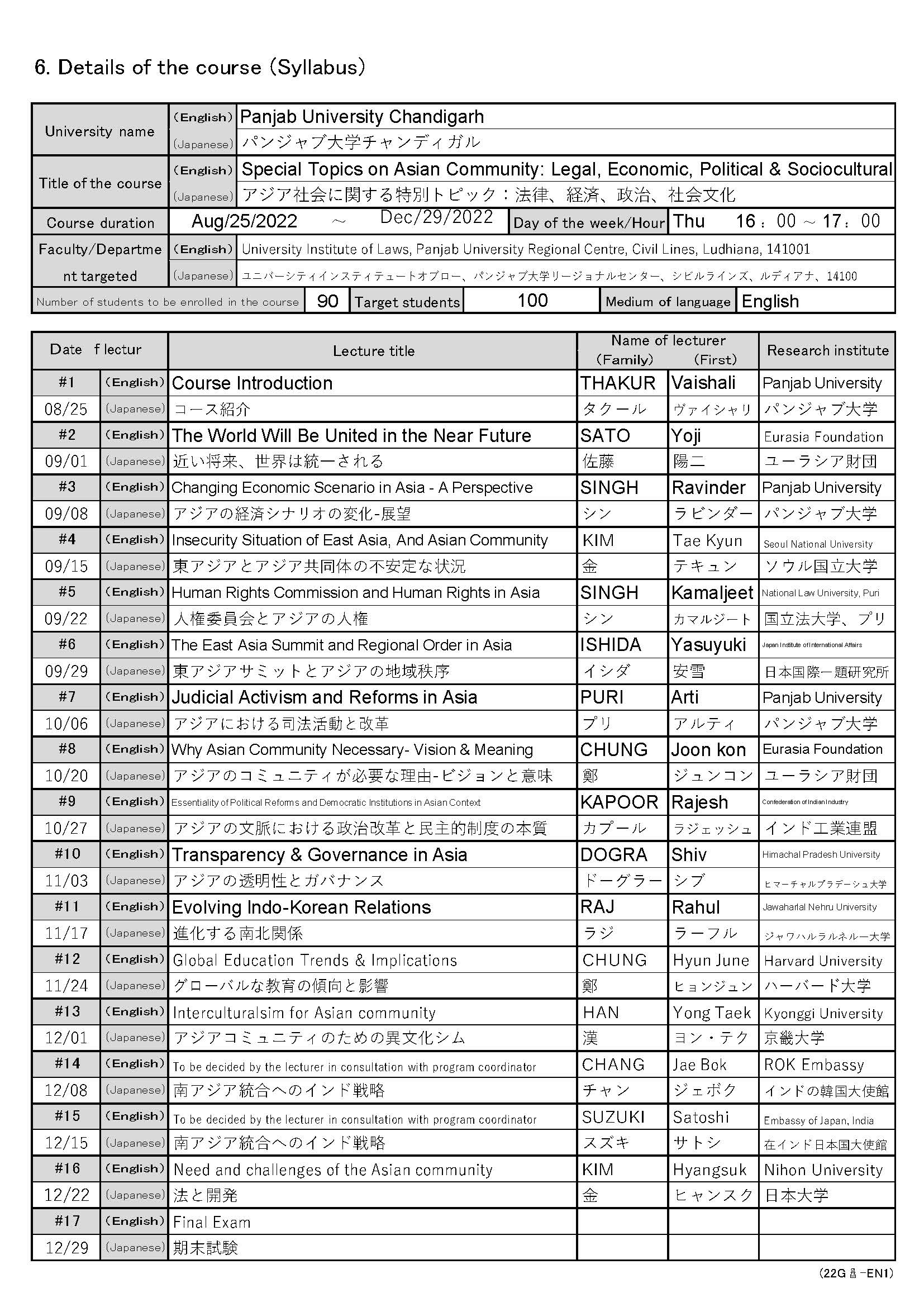 First year Jan. 2021 - Apr. 2021 Special Topics on Asian Community: Legal, Environmental, Political and Socio-cultural Second year Aug. 2022 - Dec. 2022 Special Topics on Asian Community: Legal, Economic, Political and Socio-cultural - National Law University Jodhpur(Jodhpur)