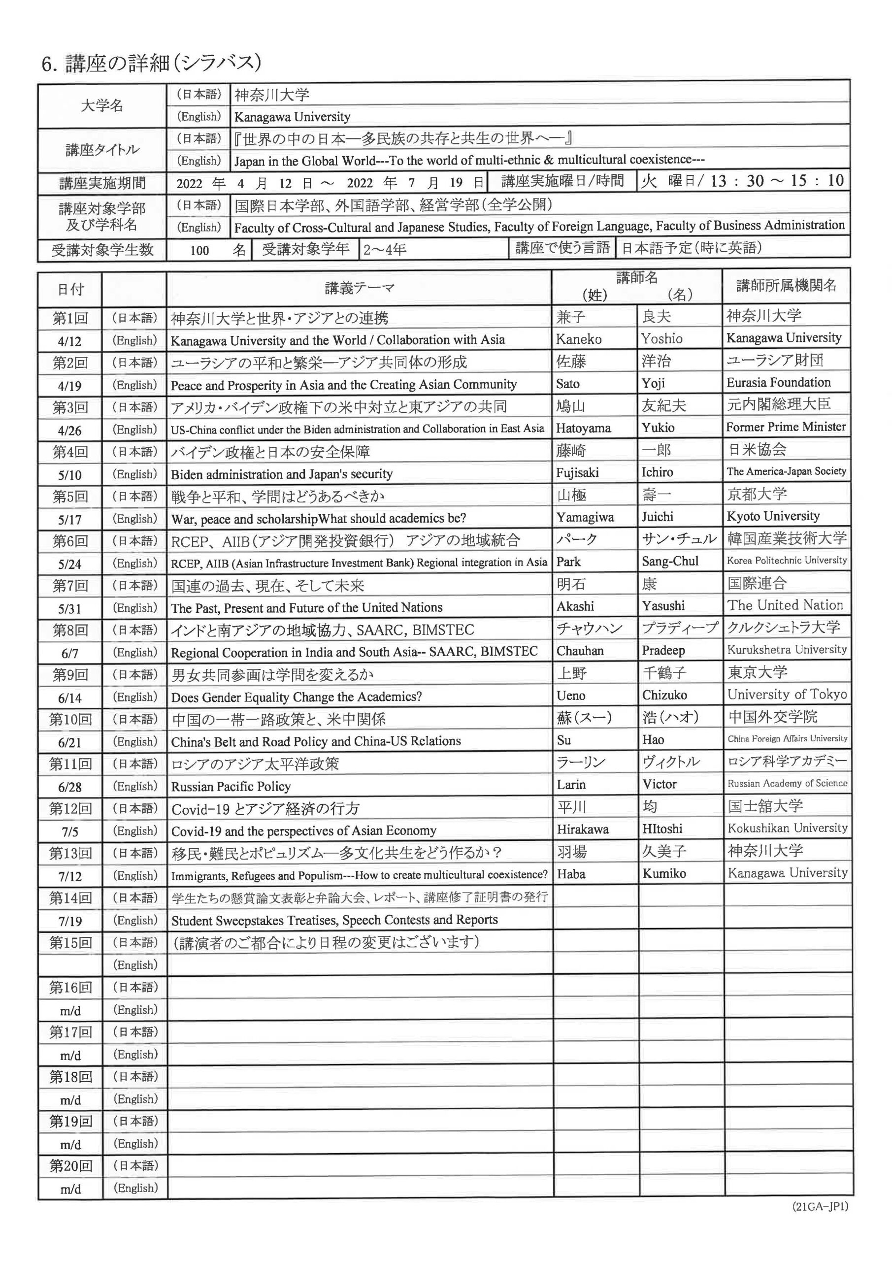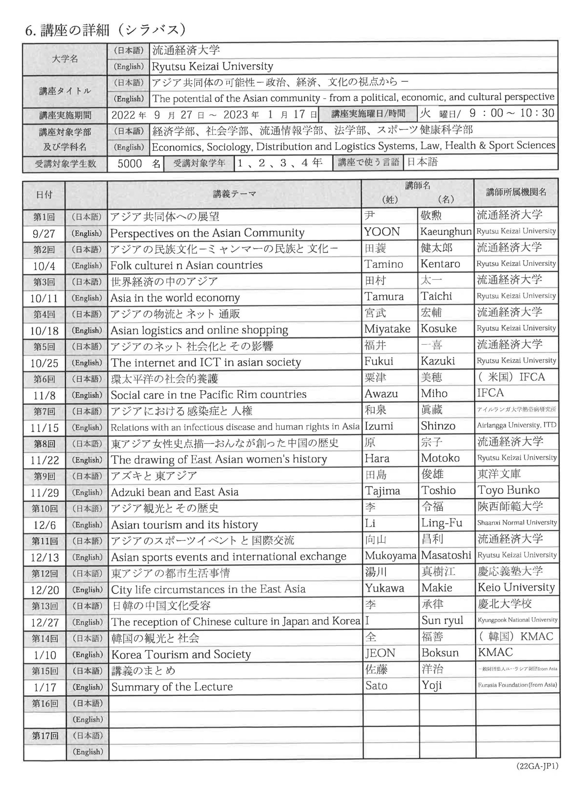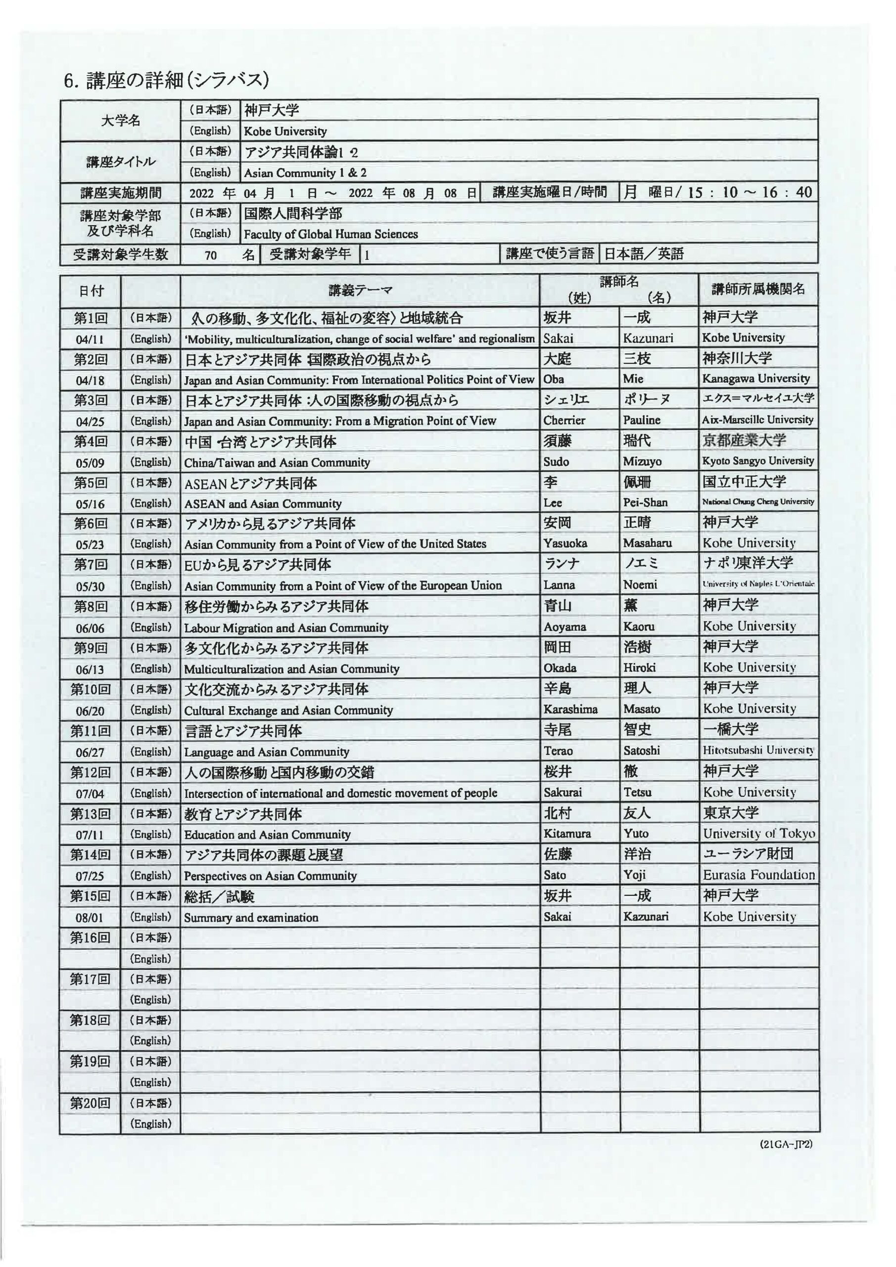 Scholarship Awarded: 6 StudentsThird year Apr. 2021 - Jul. 2021 Asian Community in a Global Migration Era Fourth year Apr. 2022 - Aug. 2022 Asian Community 1 & 2 -