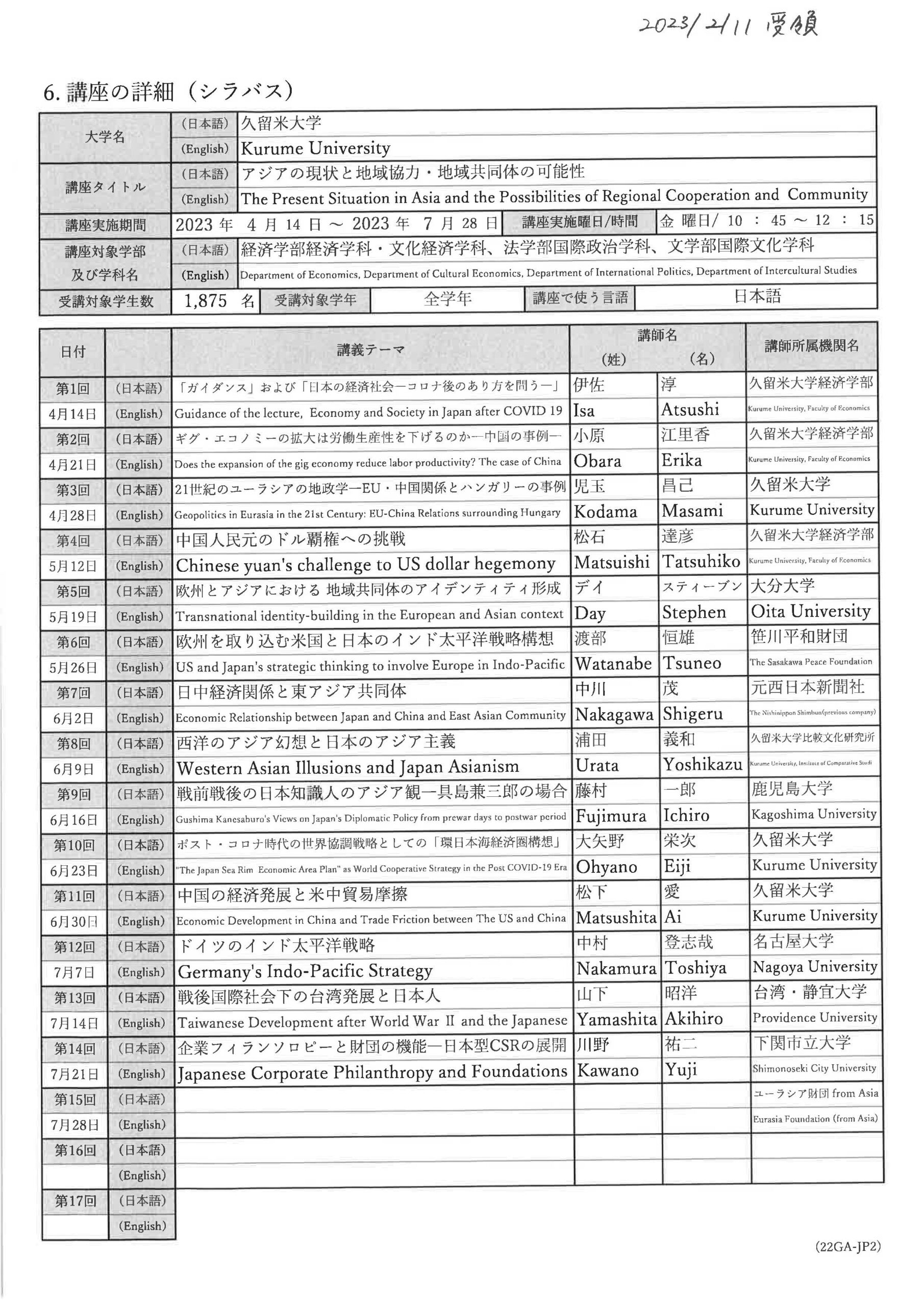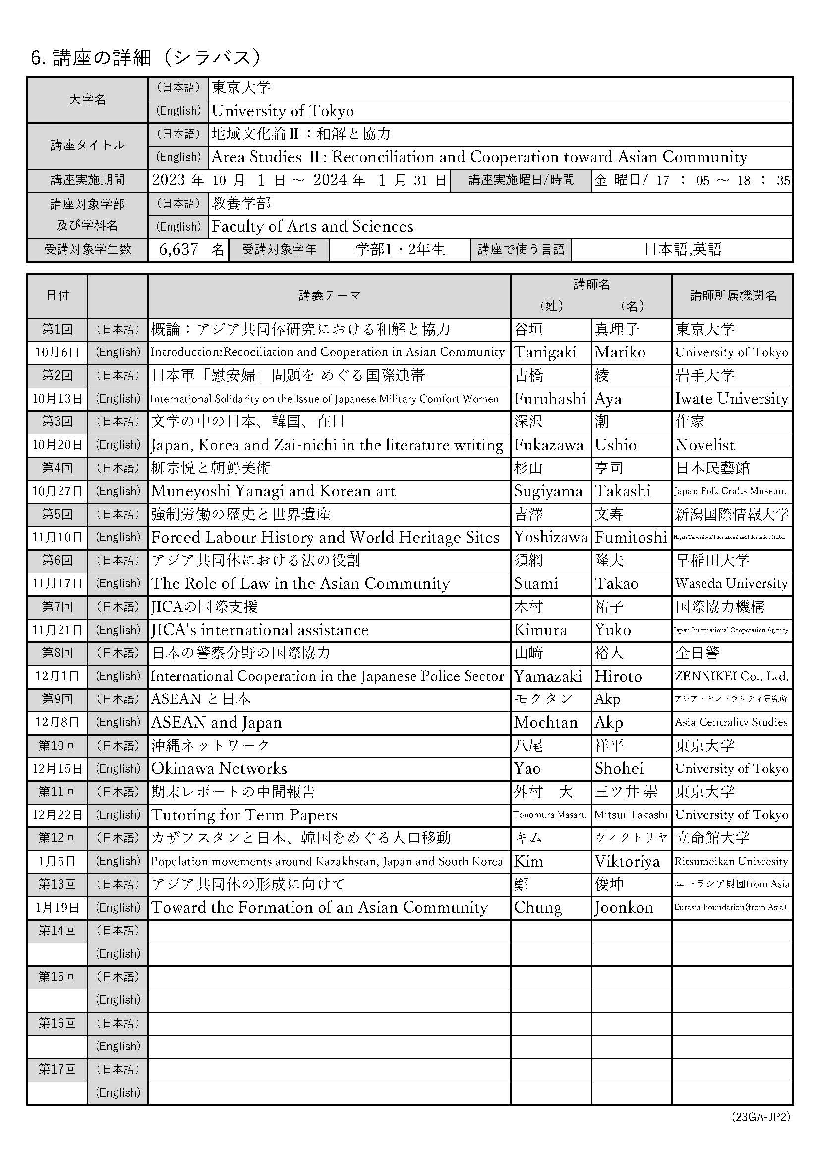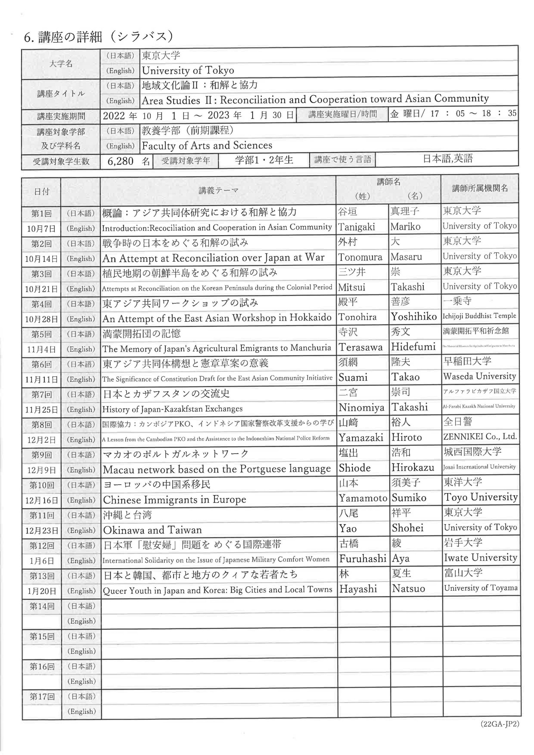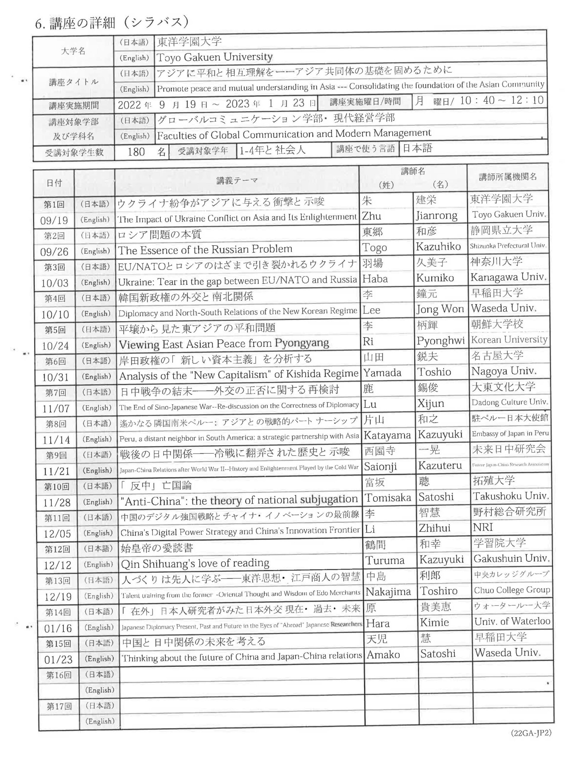 Scholarship Awarded: 9 StudentsThird year Apr. 2014 - Jul. 2014 Comprehensive course; “General studies on Asian regional integration” Fourth year Apr. 2015 - Jul. 2015 Asian Community -political, economic, and cultural- Fifth year Apr. 2016 - Aug. 2016 Asian Community -political, economic, and cultural- Sixth year Apr. 2017 - Jul. 2017 Special Lecture on Integrated Study Course (Discourse on East Asian Community) Seventh year Apr. 2018 - Jul. 2018 East Asian Community-politics, economy and culture Eighth year Oct. 2019 - Jan. 2020 East Asian Community-politics, economy and culture Ninth year Oct. 2020 - Jan. 2021 East Asian Community Theory-Politics,Economy,Culture Tenth year Oct. 2021 - Jan. 2022 East Asian Community Theory- Politics, Economy, Culture - College of Arts and Science, University of Tokyo(Tokyo)