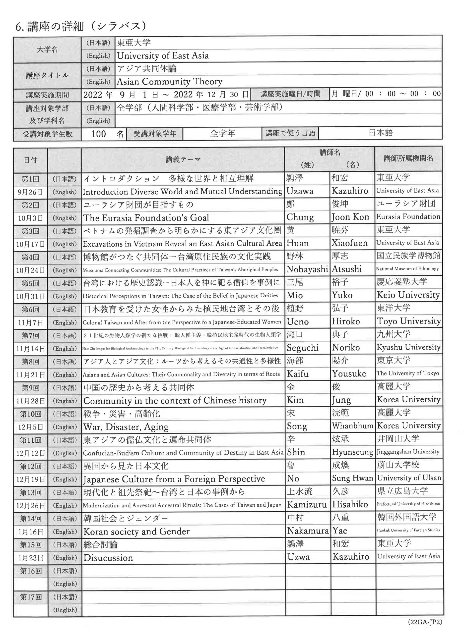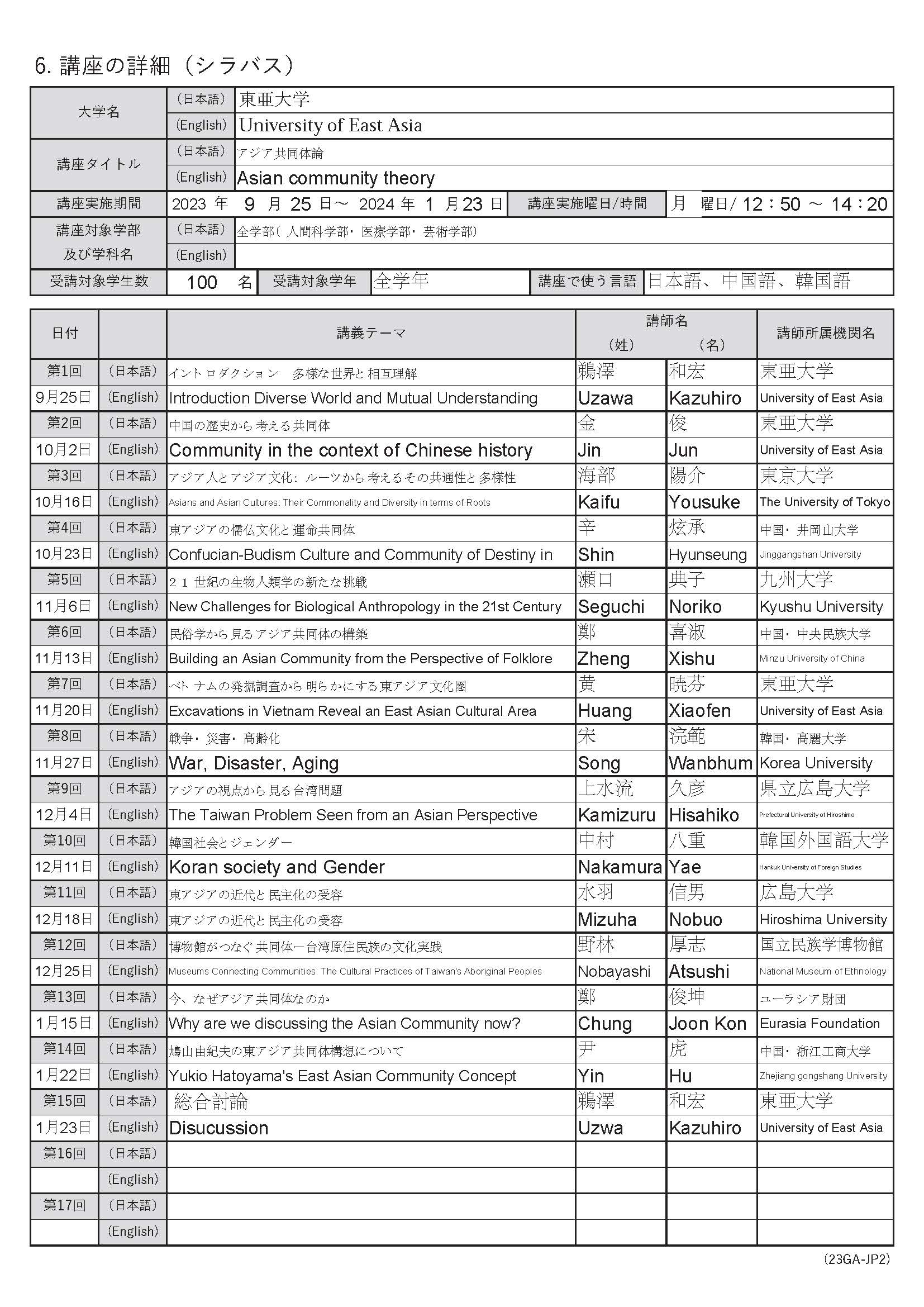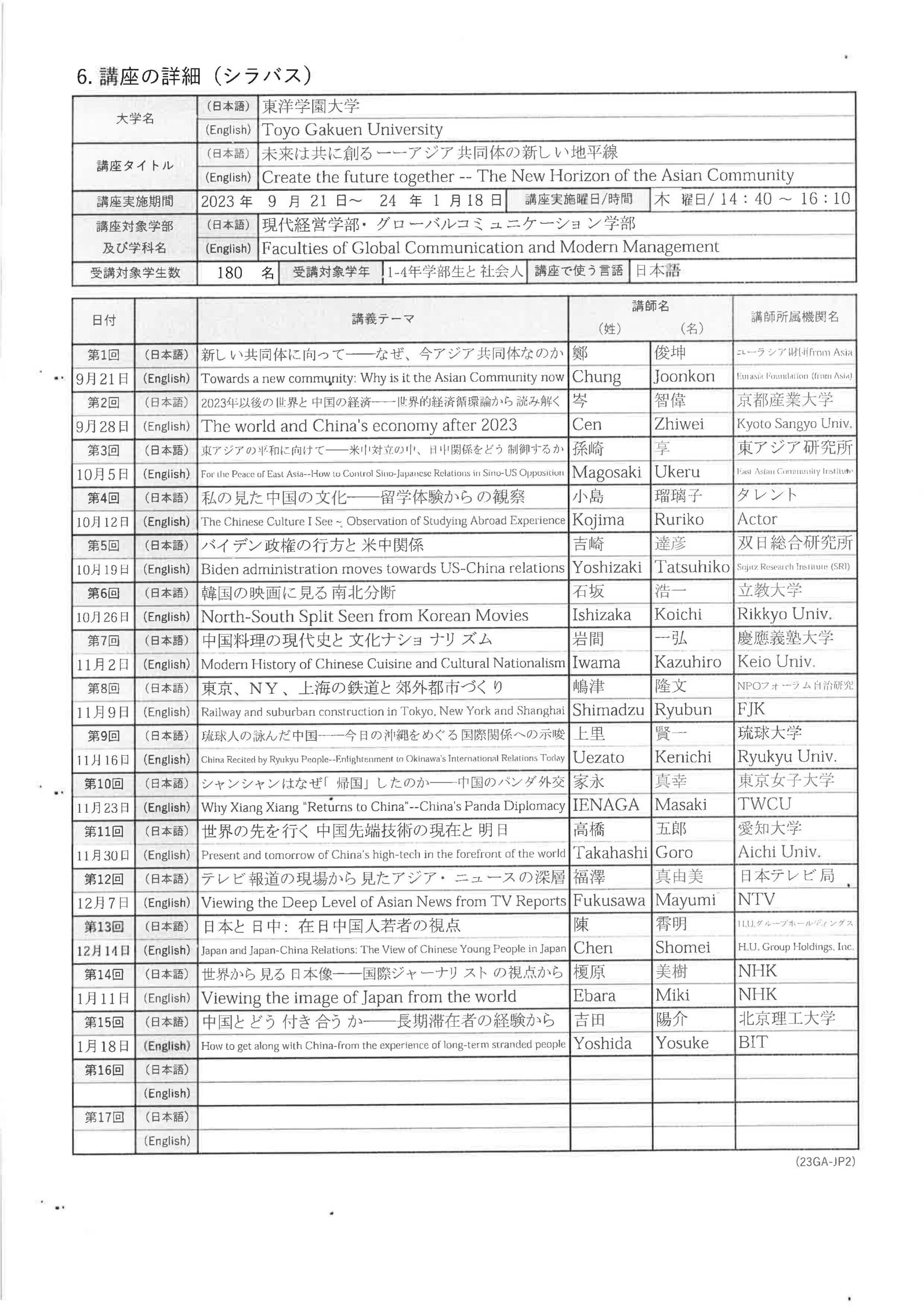 First year Sep. 2013 - Jan. 2014 Asian Community - from a Mutilateral Viewpoint - Second year Sep. 2014 - Jan. 2015 Asian Community - from a Mutilateral Viewpoint(Ⅱ) Third year Sep. 2015 - Jan. 2016 Asian Community - from a Multilateral Viewpoint(Ⅲ) Fourth year Sep. 2016 - Jan. 2017 Asian Community - from a Multilateral Viewpoint(Ⅳ) Fifth year Sep. 2017 - Jan. 2017 Asian Community Studies Sixth year Sep. 2018 - Jan. 2019 Asian Community Studies Seventh year Sep. 2019 - Jan. 2020 Asian Community Studies - Meiji University(Tokyo)