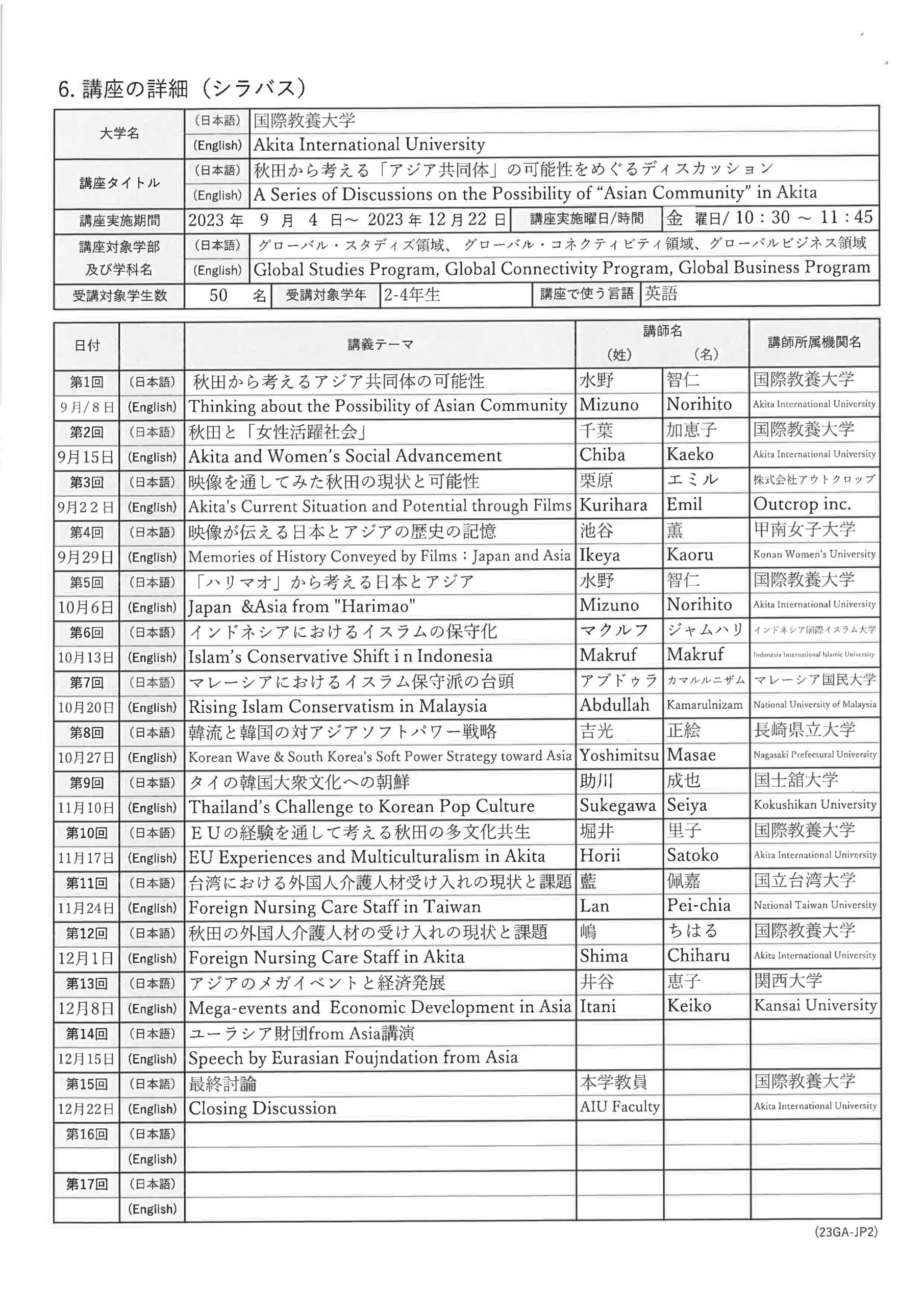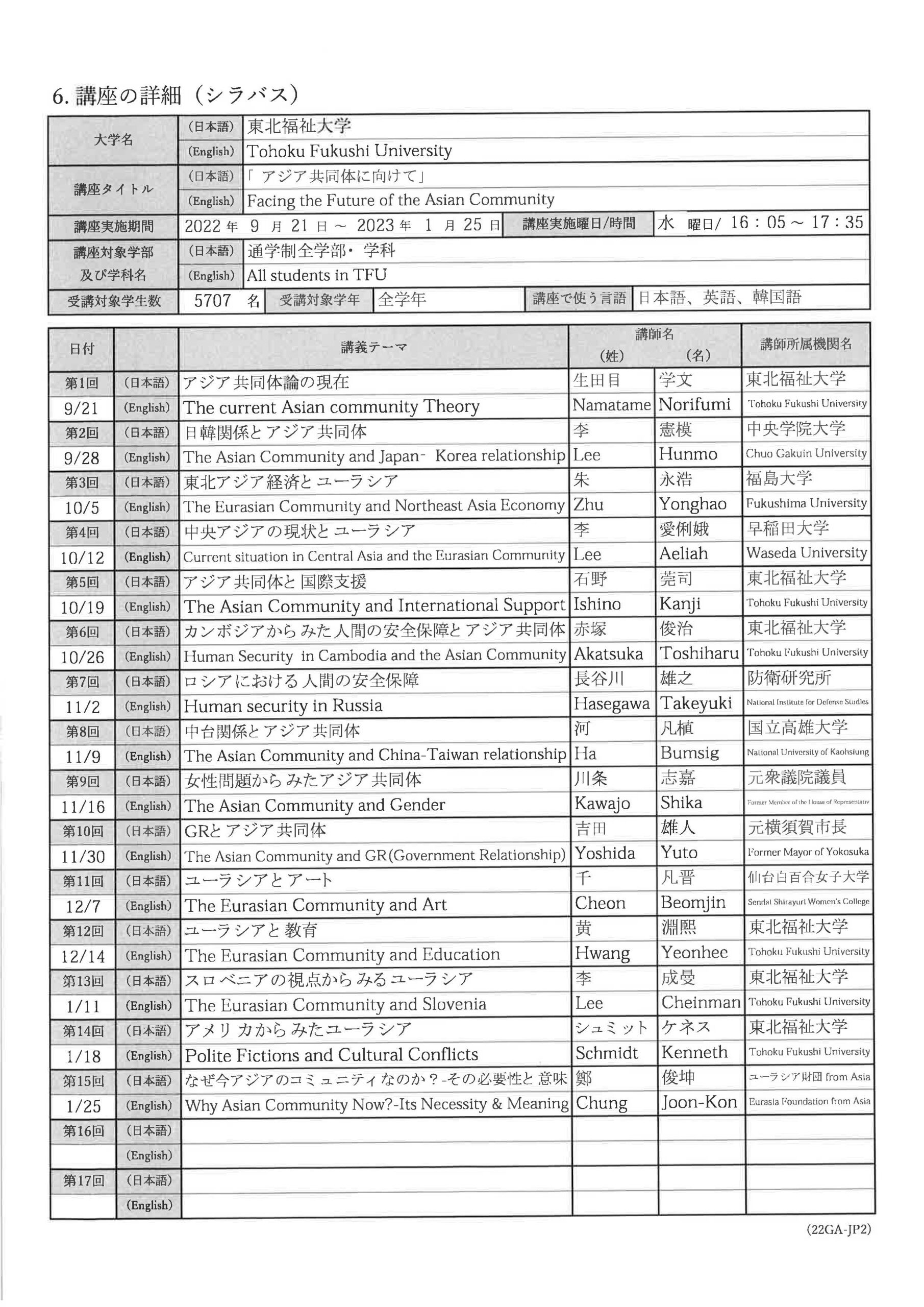 First year Sep. 2021 - Jan. 2022 The Potential of the Asian Community- from a Political, economic, and cultural Perspective Second year Sep. 2022 - Jan. 2023 The Potential of the Asian Community- from a Political, economic, and cultural Perspective - Tohoku University(Miyagi)