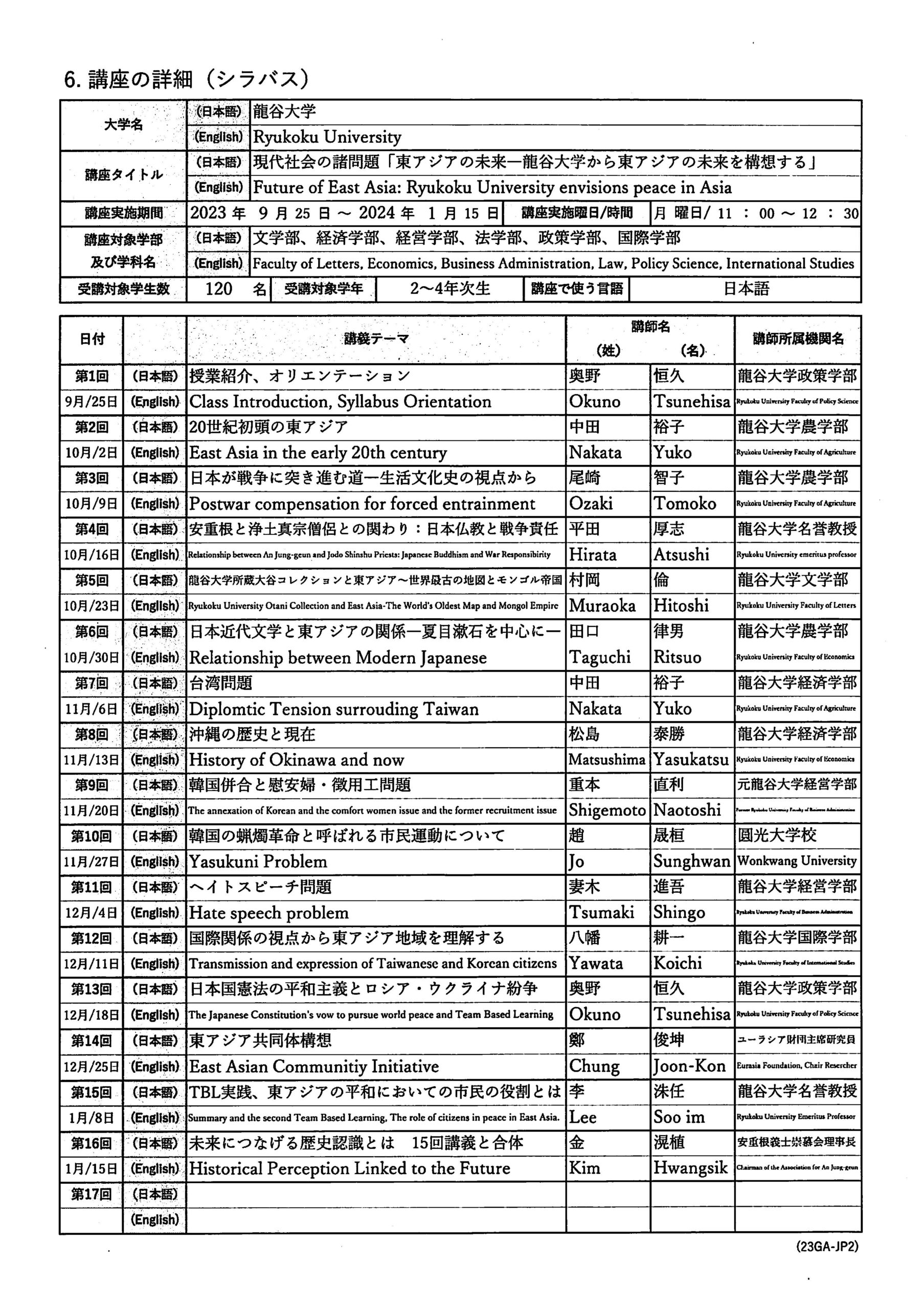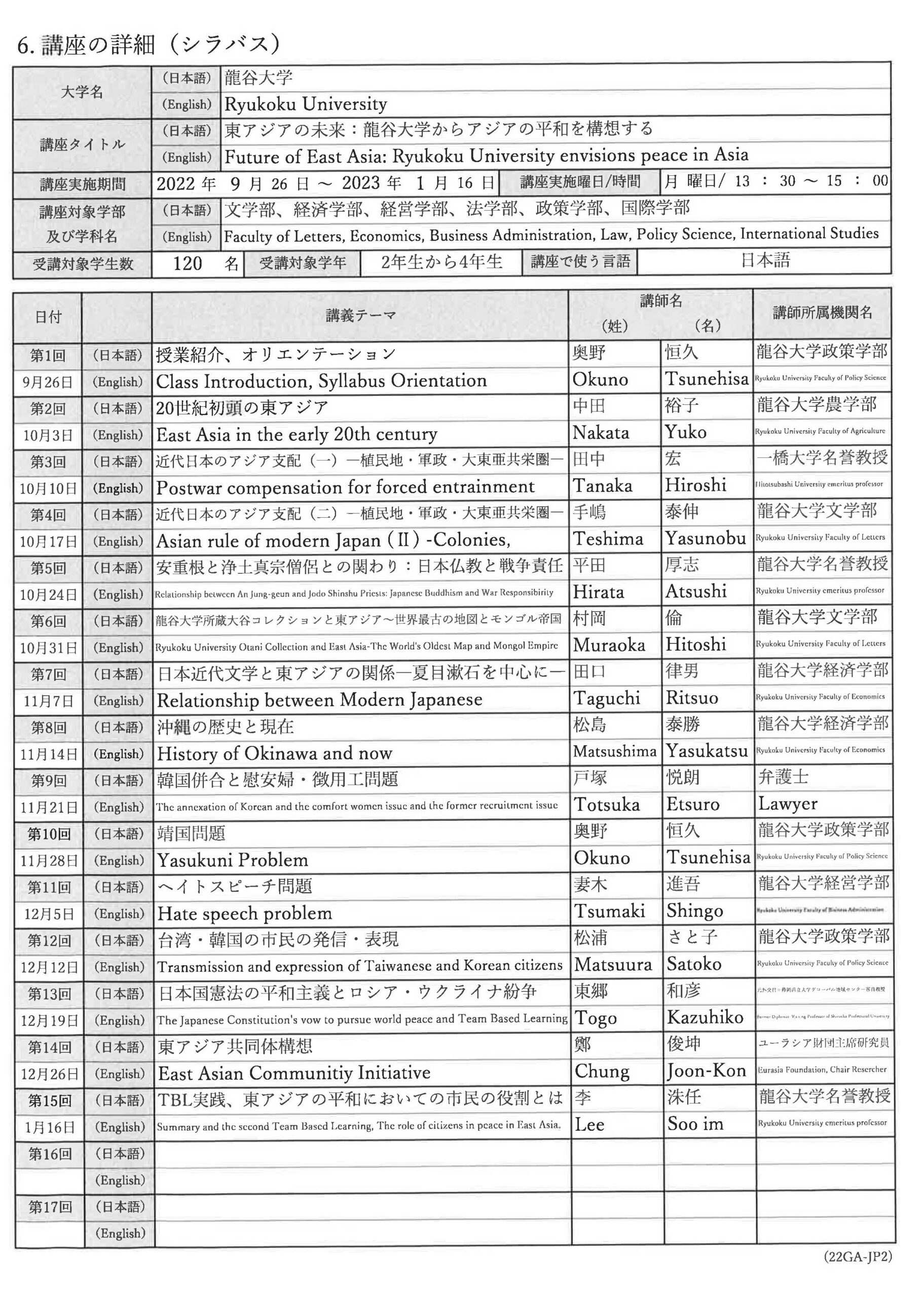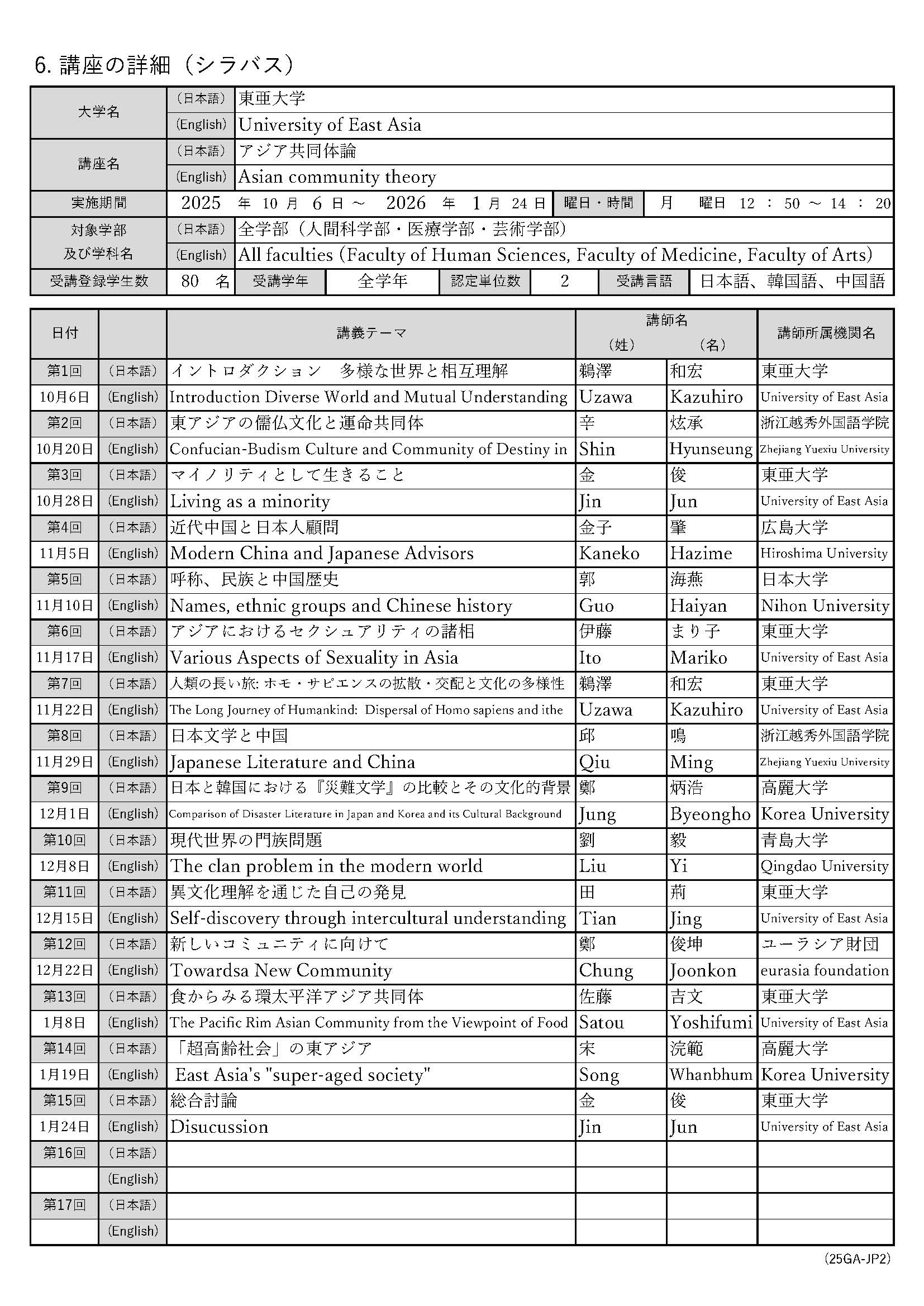 First year Apr. 2012 - Jan. 2013 First Semester: Political Situation in Asia Second Semester: Envisioning Asian Community Second year Apr. 2013 - Jan. 2014 First Semester: Borderline in Asia Second Semester: Think of Asian Community Third year Apr. 2015 - Mar. 2016 First Semester: Asian Community and the movement of persons Second Semester:Think of Asian Community - Ritsumeikan University(Kyoto)