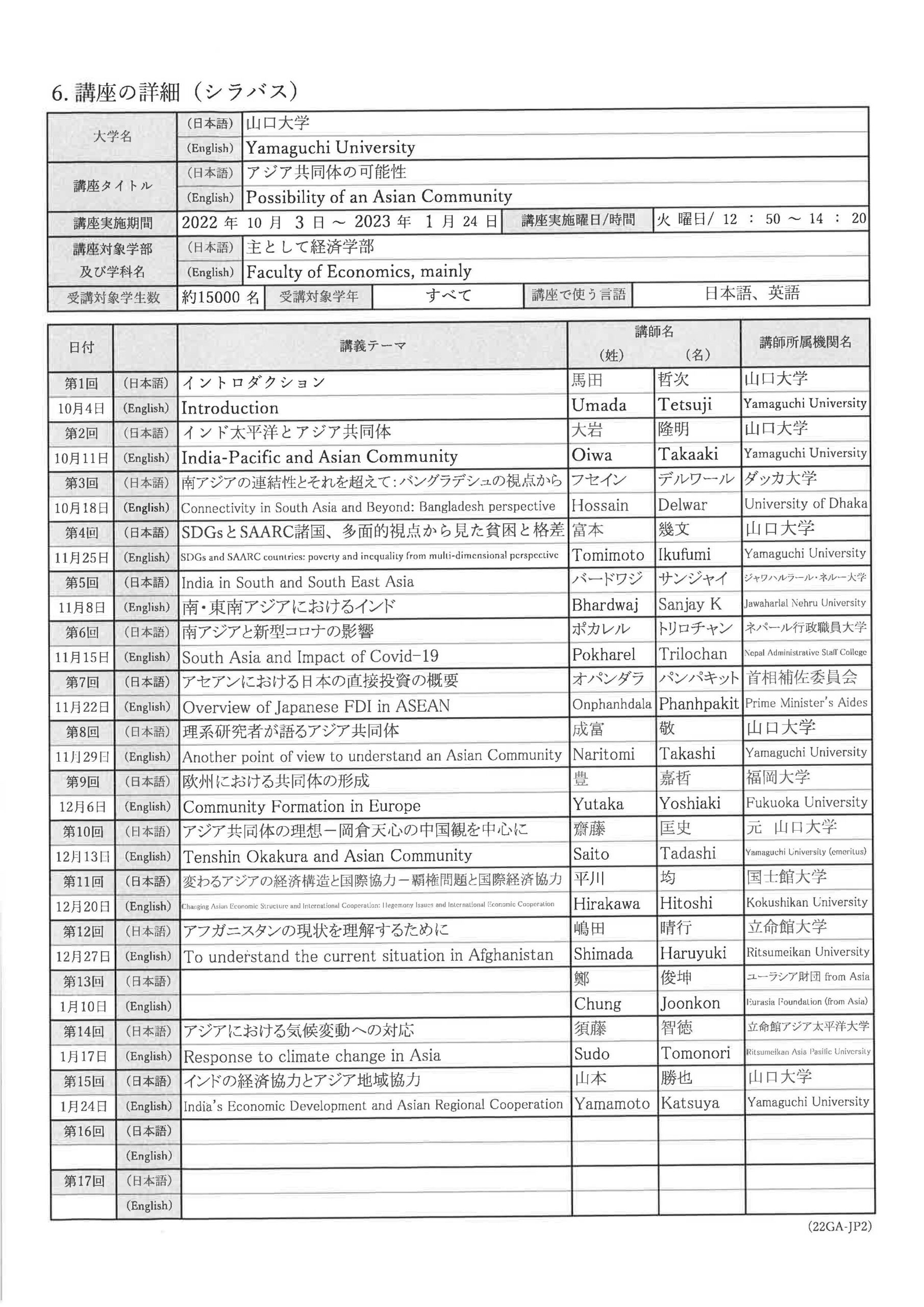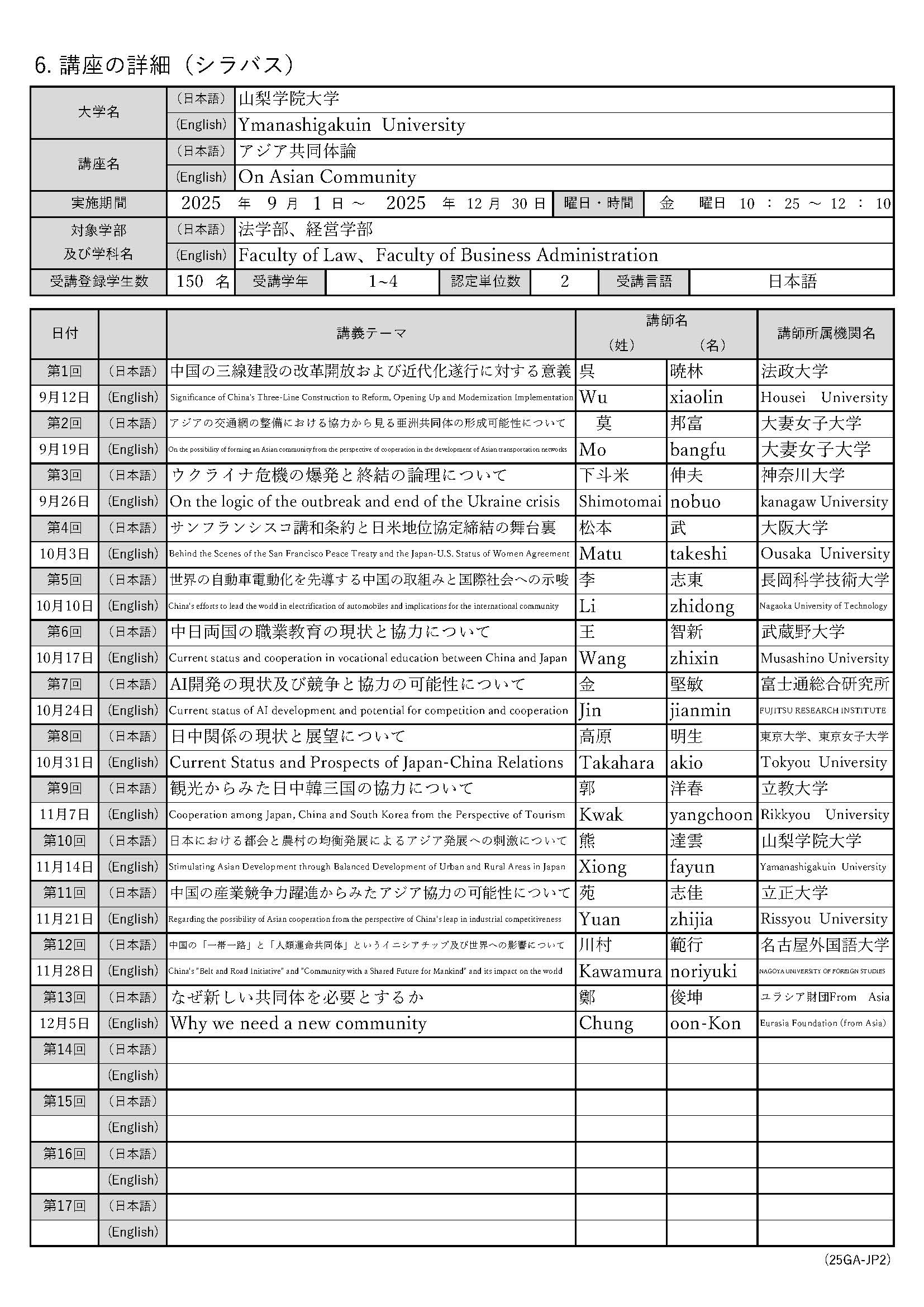 (Scholarship Awarded: 14 Students)Second year Apr. 2020 - Jul. 2020 Theory of Asian Society - Yamanashi Gakuin University(Yamanashi)