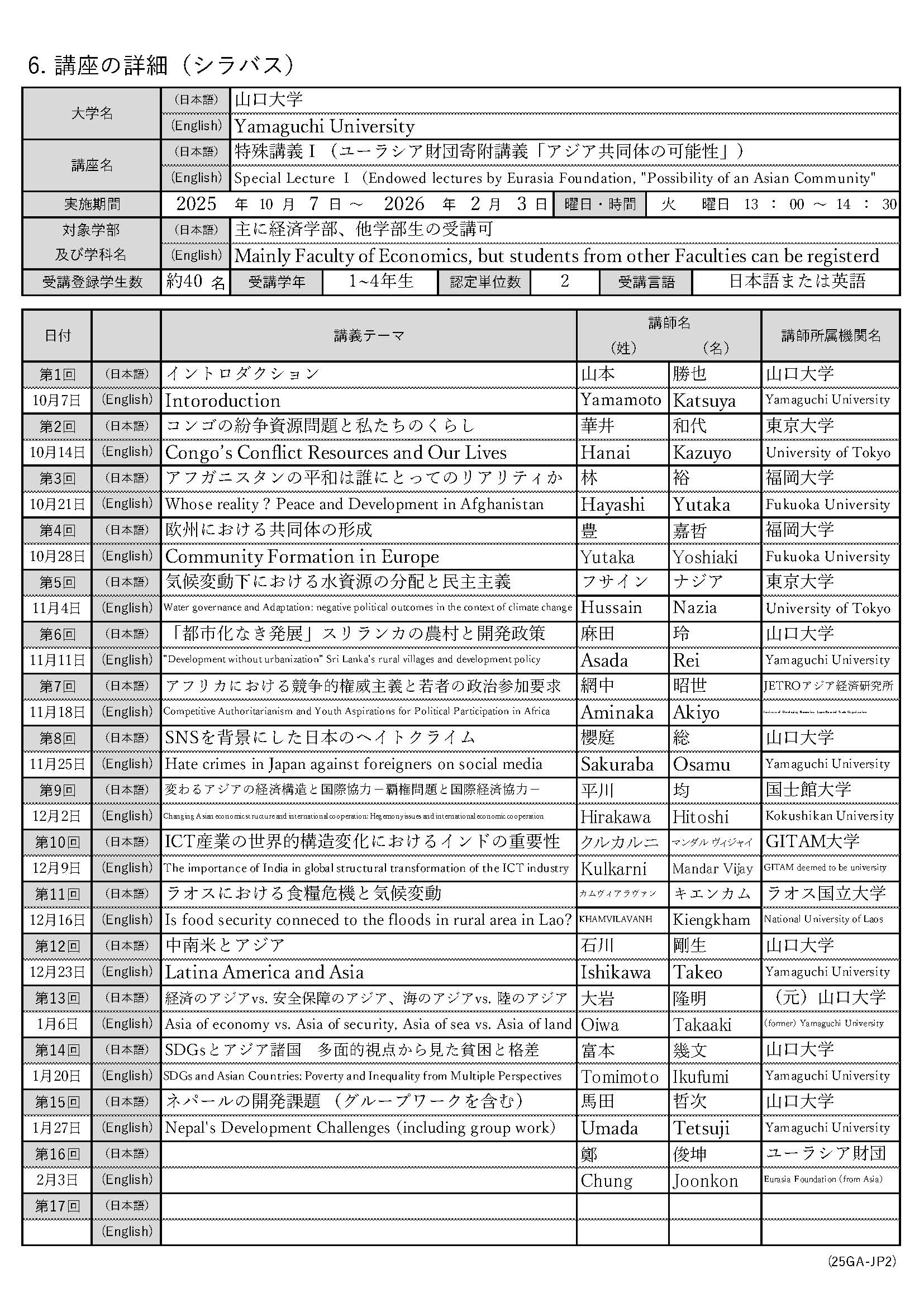 (Scholarship Awarded: 17 Students)Second year Sep. 2019 - Jan. 2020 Special lecture: Introduction to the Asian Community