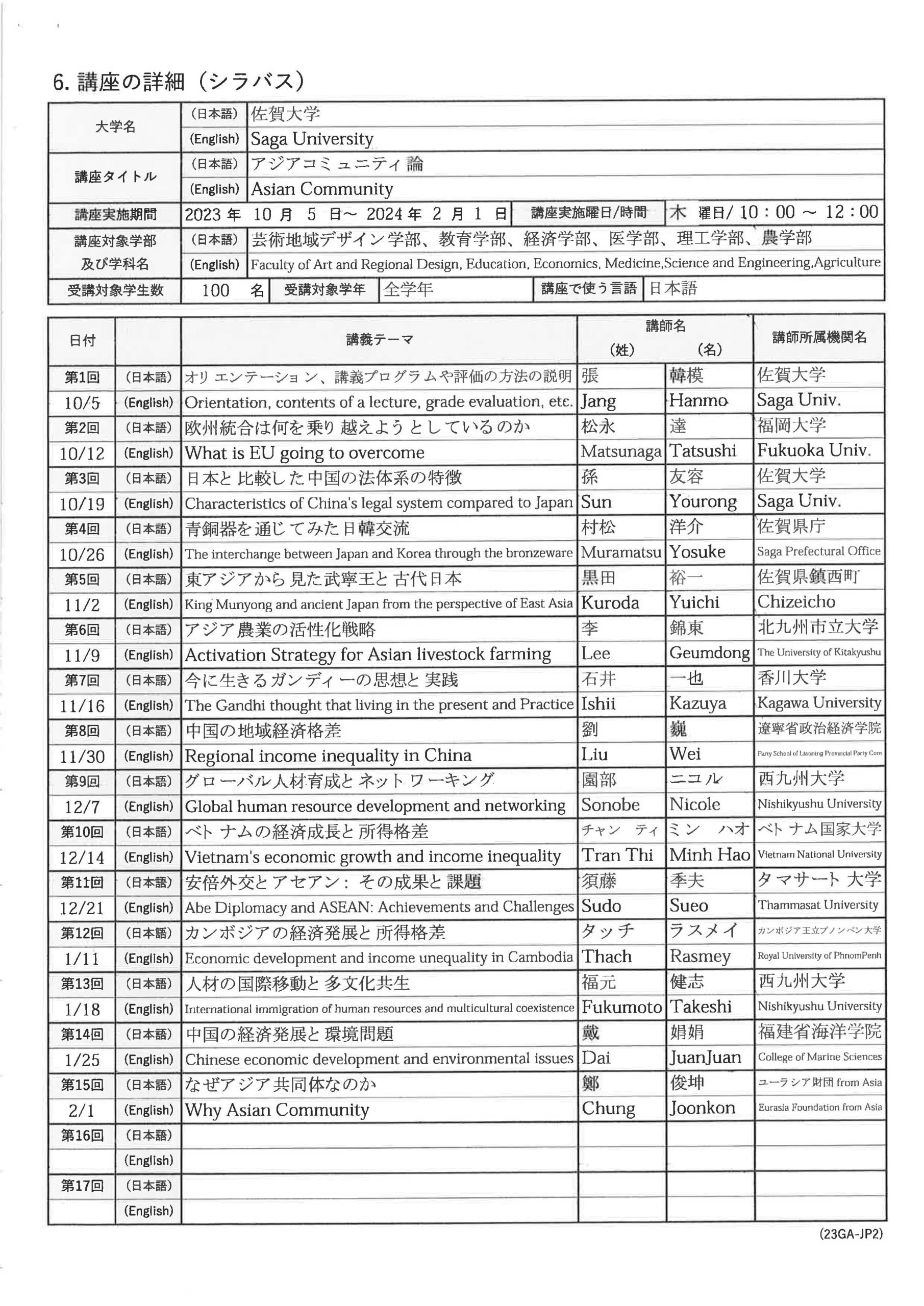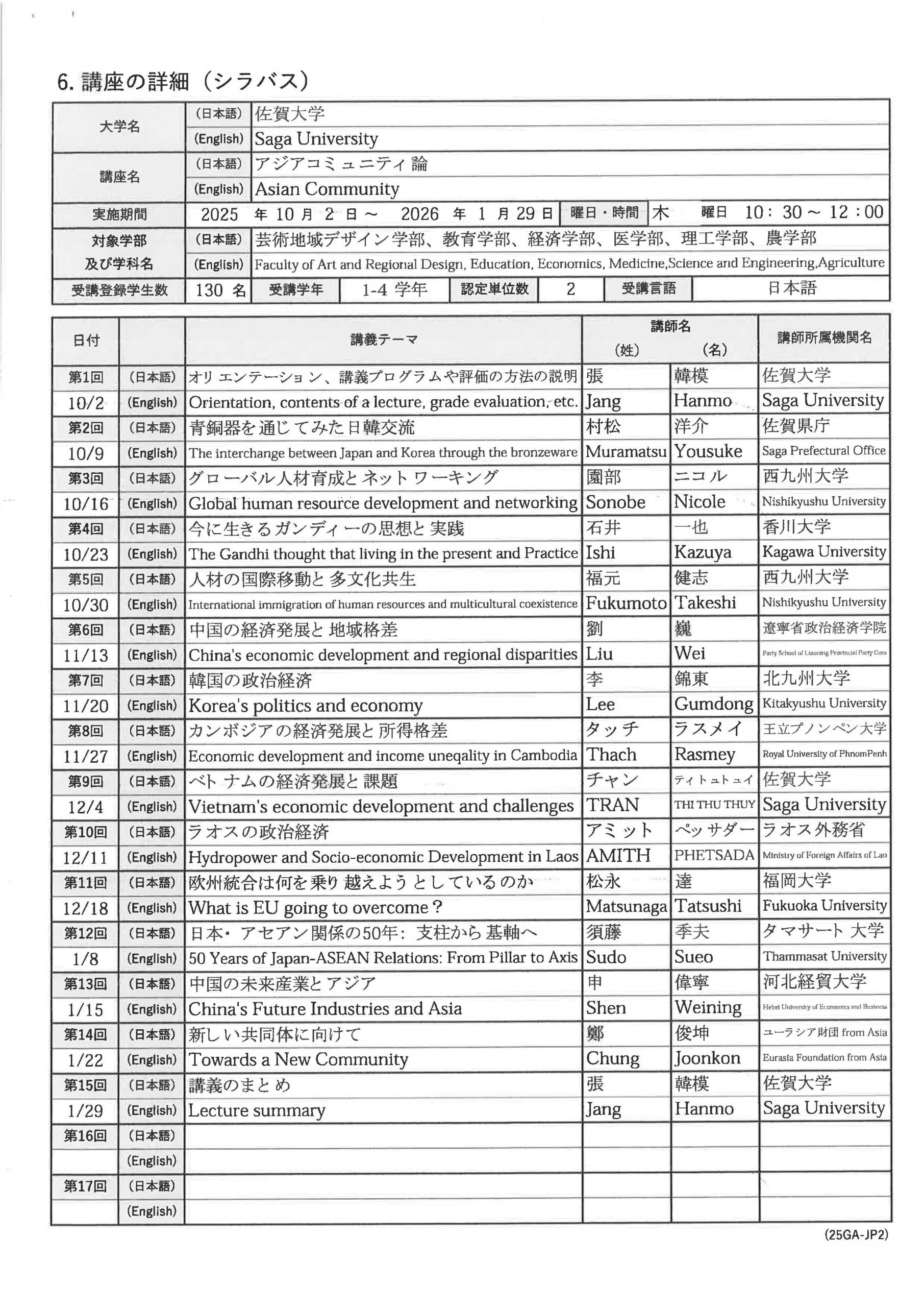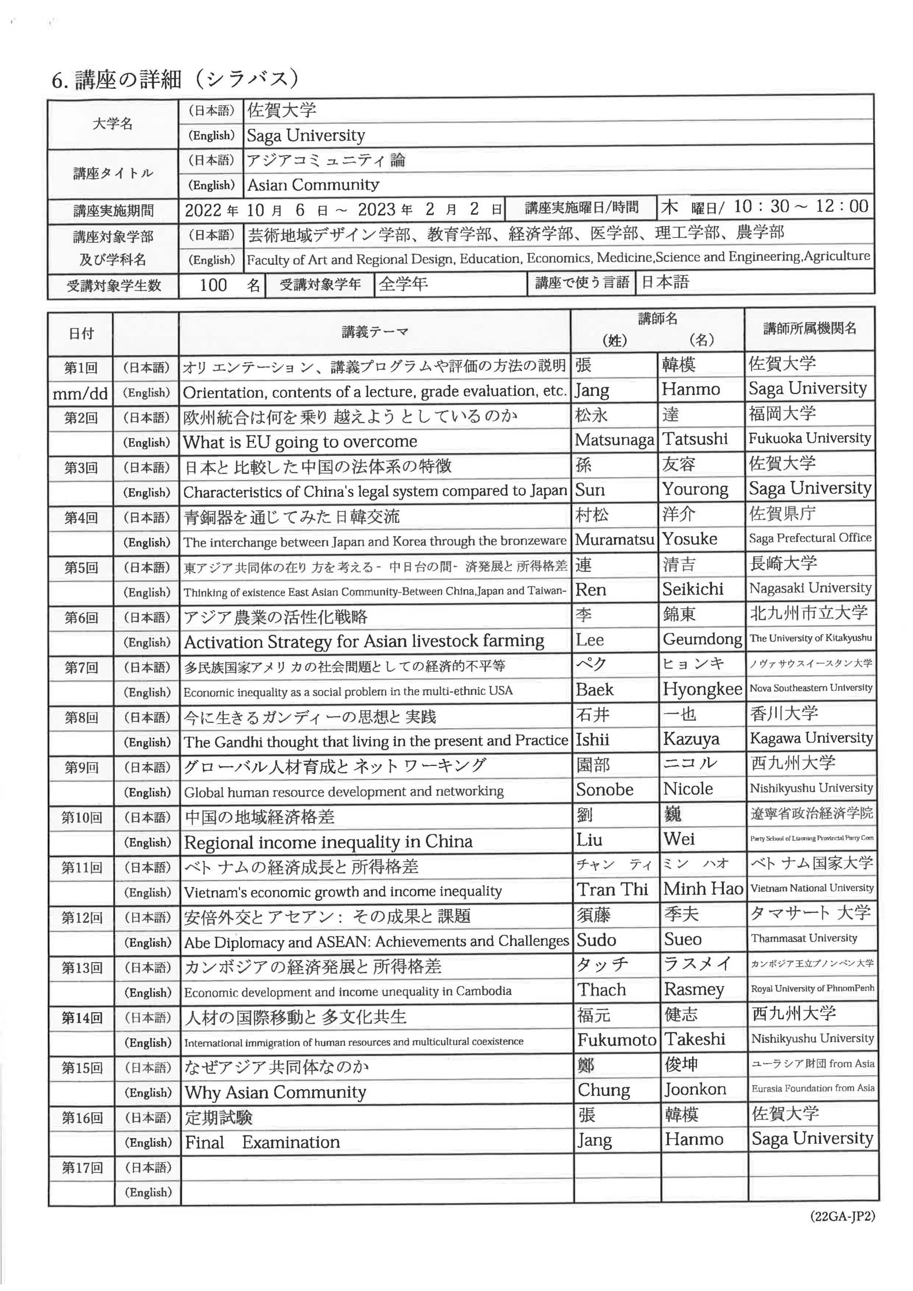 (Scholarship Awarded: 6 Students)Third year Oct. 2019 - Feb. 2020 Possibility of an Asian Community Fourth year Oct. 2020 - Feb. 2021 Possibility of an Asian Community Fifth year Oct. 2021 - Jun. 2022 Possibility of an Asian Community Sixth year Oct. 2022 - Jan. 2023 Possibility of an Asian Community Seventh year Oct. 2024 - Jan. 2025 Possibility of an Asian Community Eighth year Oct. 2025 - Feb. 2026 Possibility of an Asian Community - Saga University(Saga)