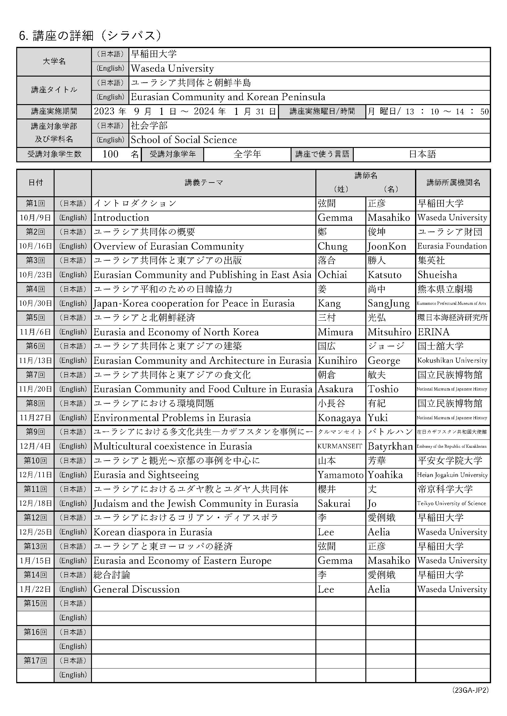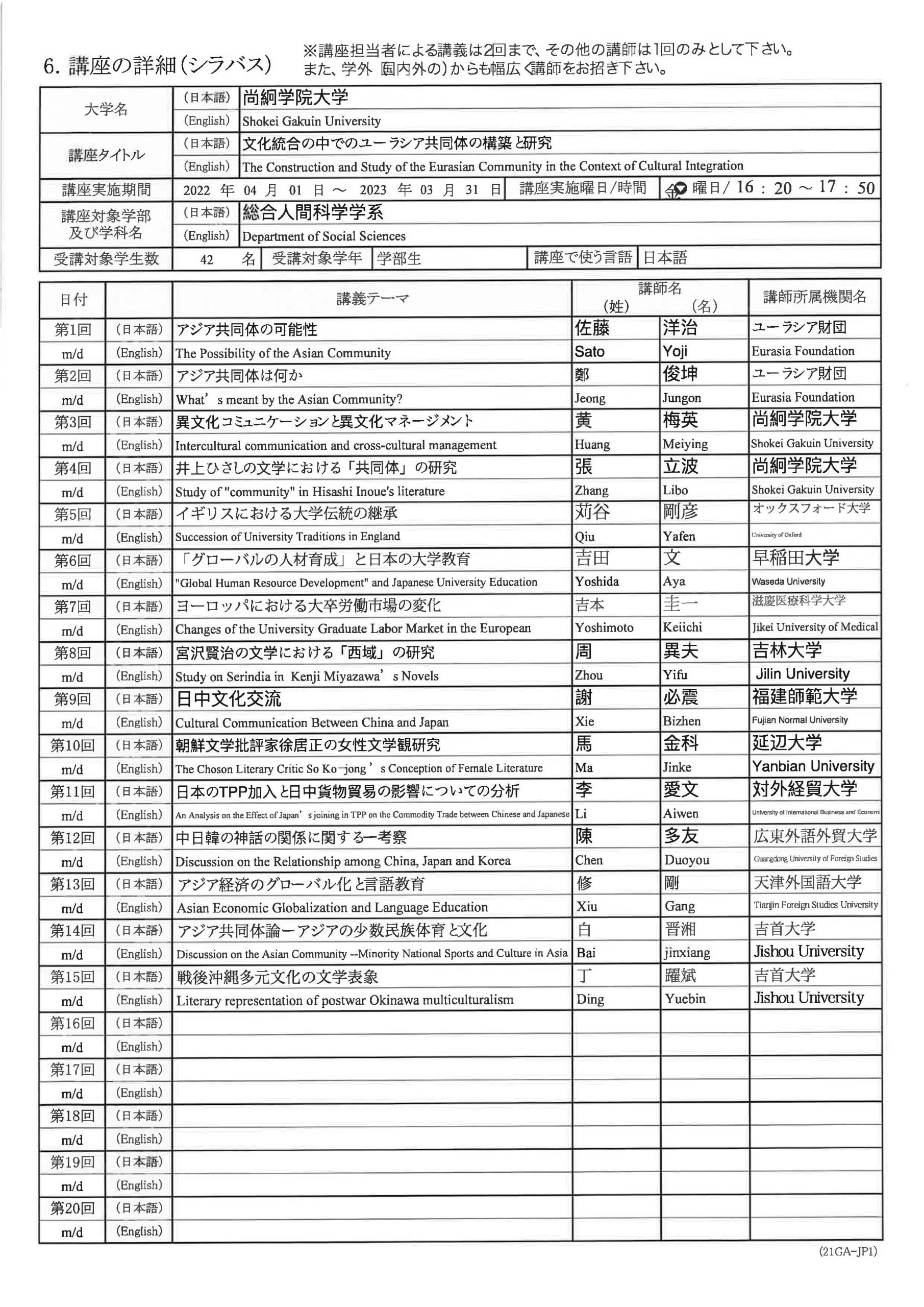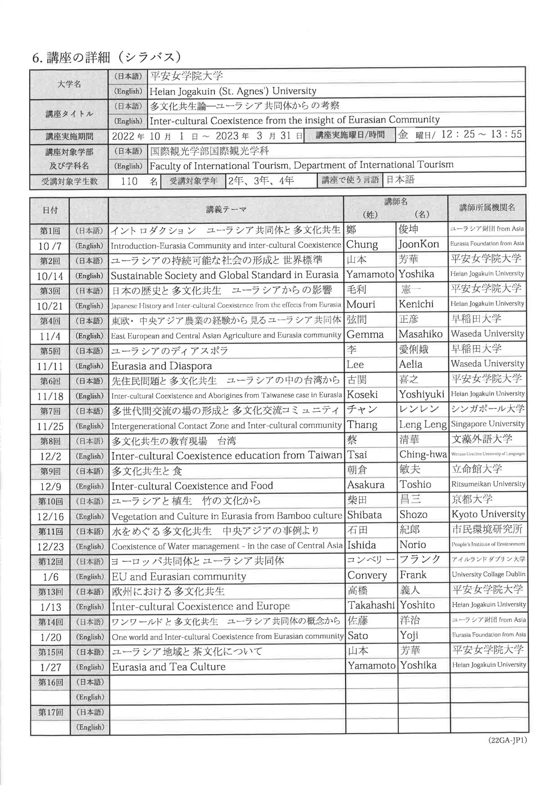 First year Oct. 2021 - Mar. 2021 Inter-cultural Coexistence from the insight of Eurasian Community Second year Oct. 2022 - Jan. 2023 Inter-cultural Coexistence from the insight of Eurasian Community Third year Oct. 2024 - Jan. 2025 Regional Environmental Resources and Sustainable Tourism (in case of Eurasia) - Toho Gakuen College of Drama and Music(Tokyo)