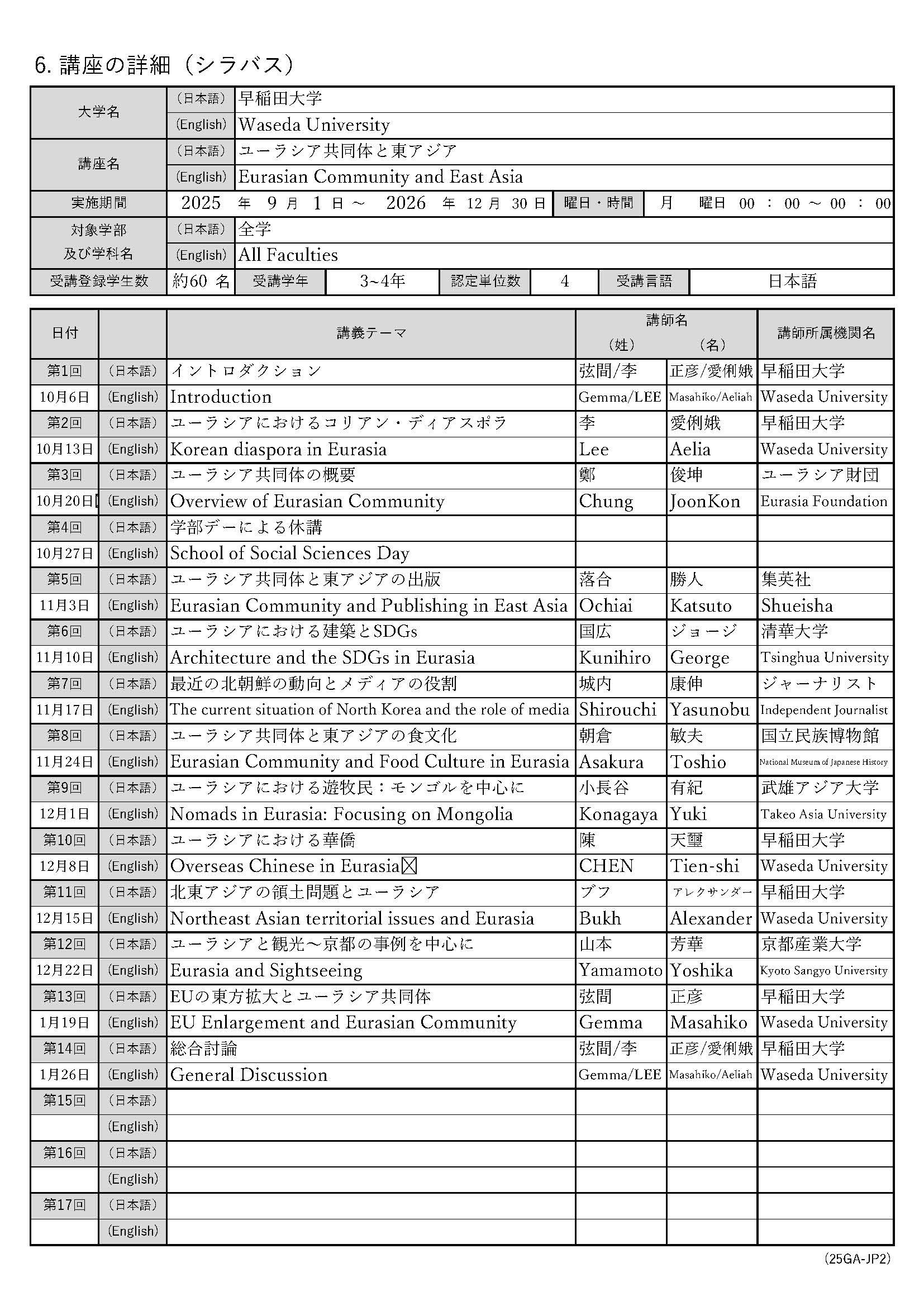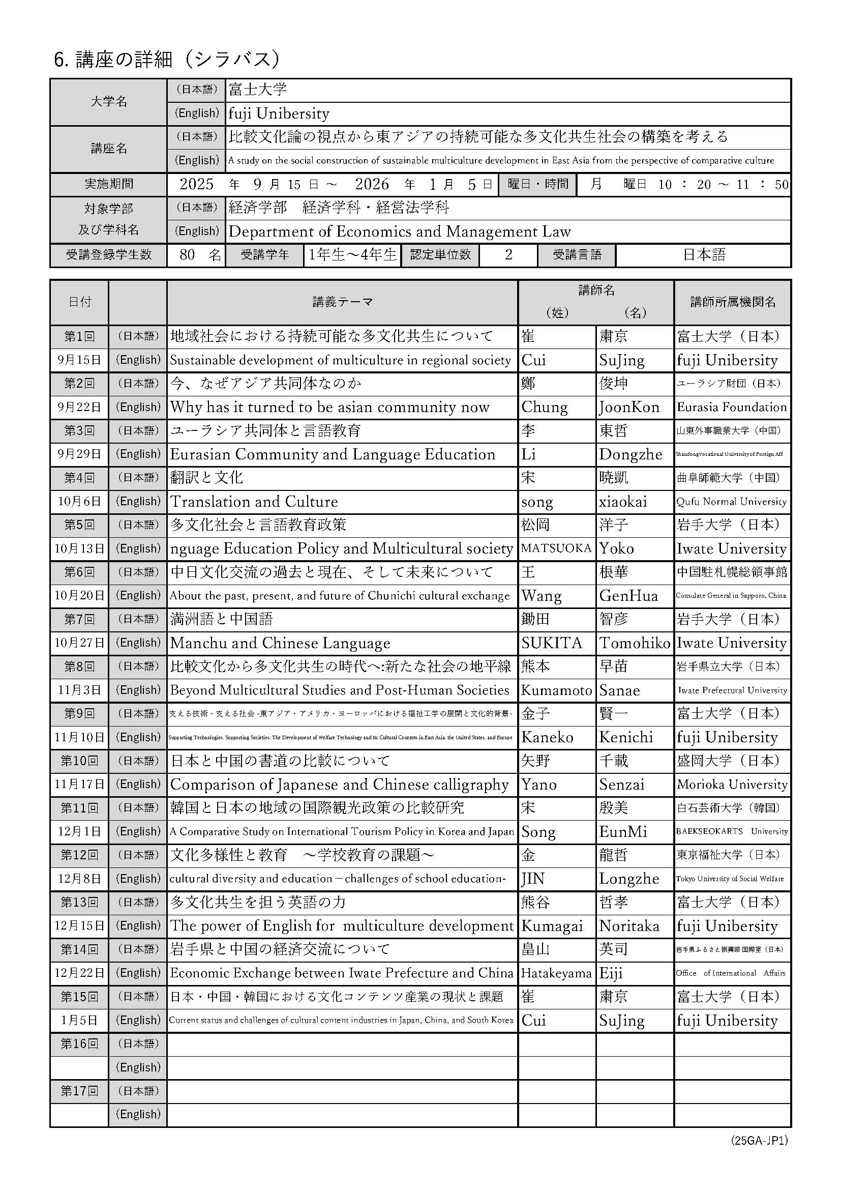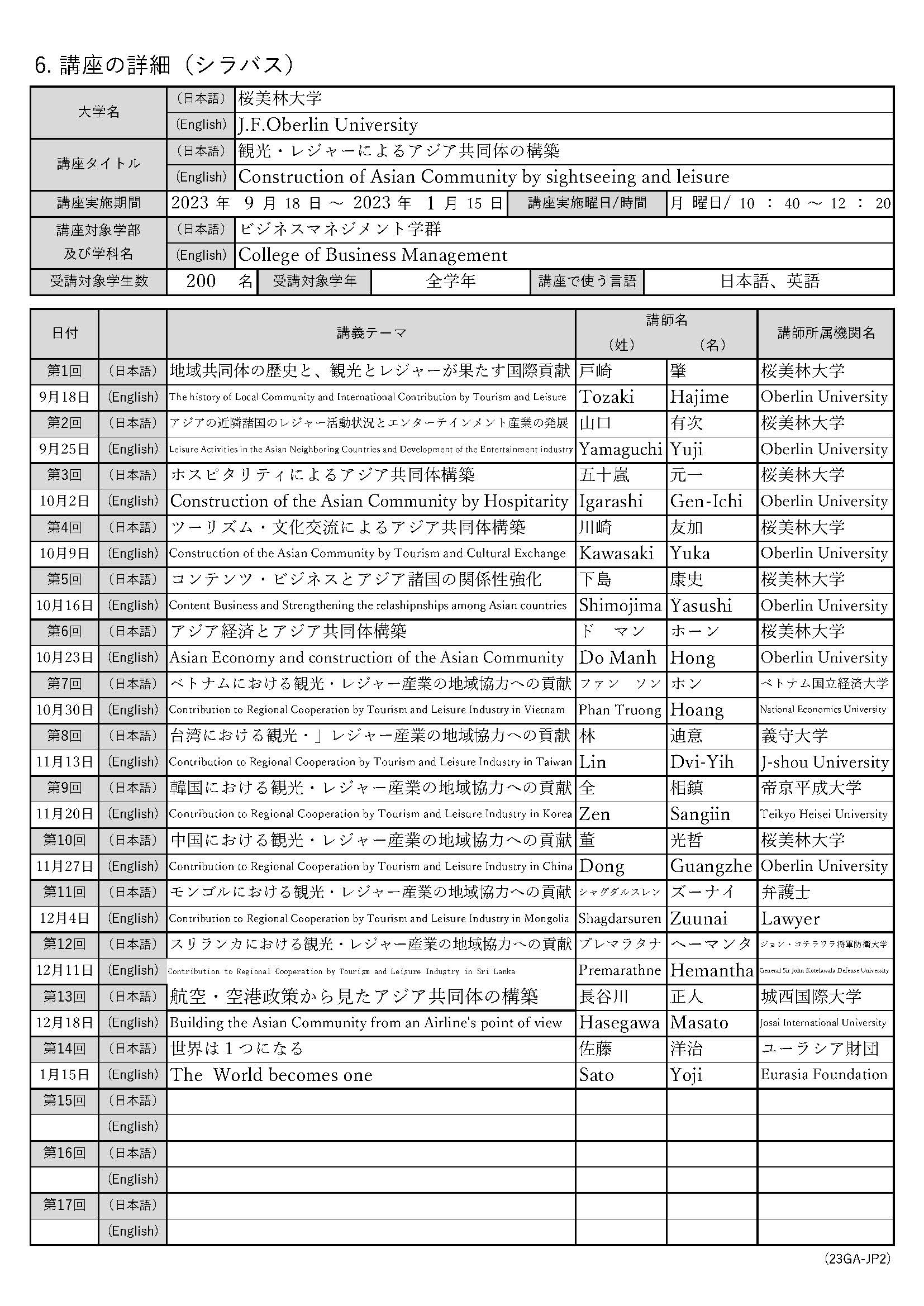 First year Oct. 2021 - Mar. 2021 Inter-cultural Coexistence from the insight of Eurasian Community Second year Oct. 2022 - Jan. 2023 Inter-cultural Coexistence from the insight of Eurasian Community Third year Oct. 2024 - Jan. 2025 Regional Environmental Resources and Sustainable Tourism (in case of Eurasia) - Toho Gakuen College of Drama and Music(Tokyo)