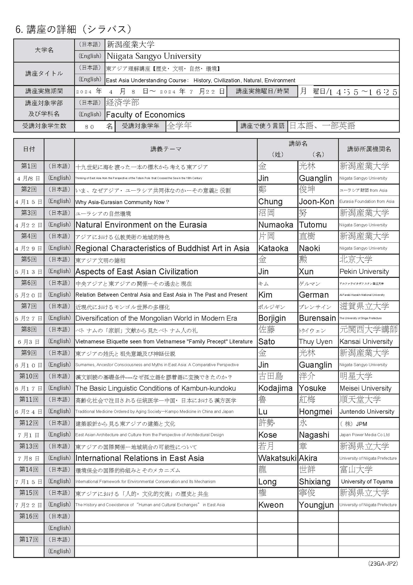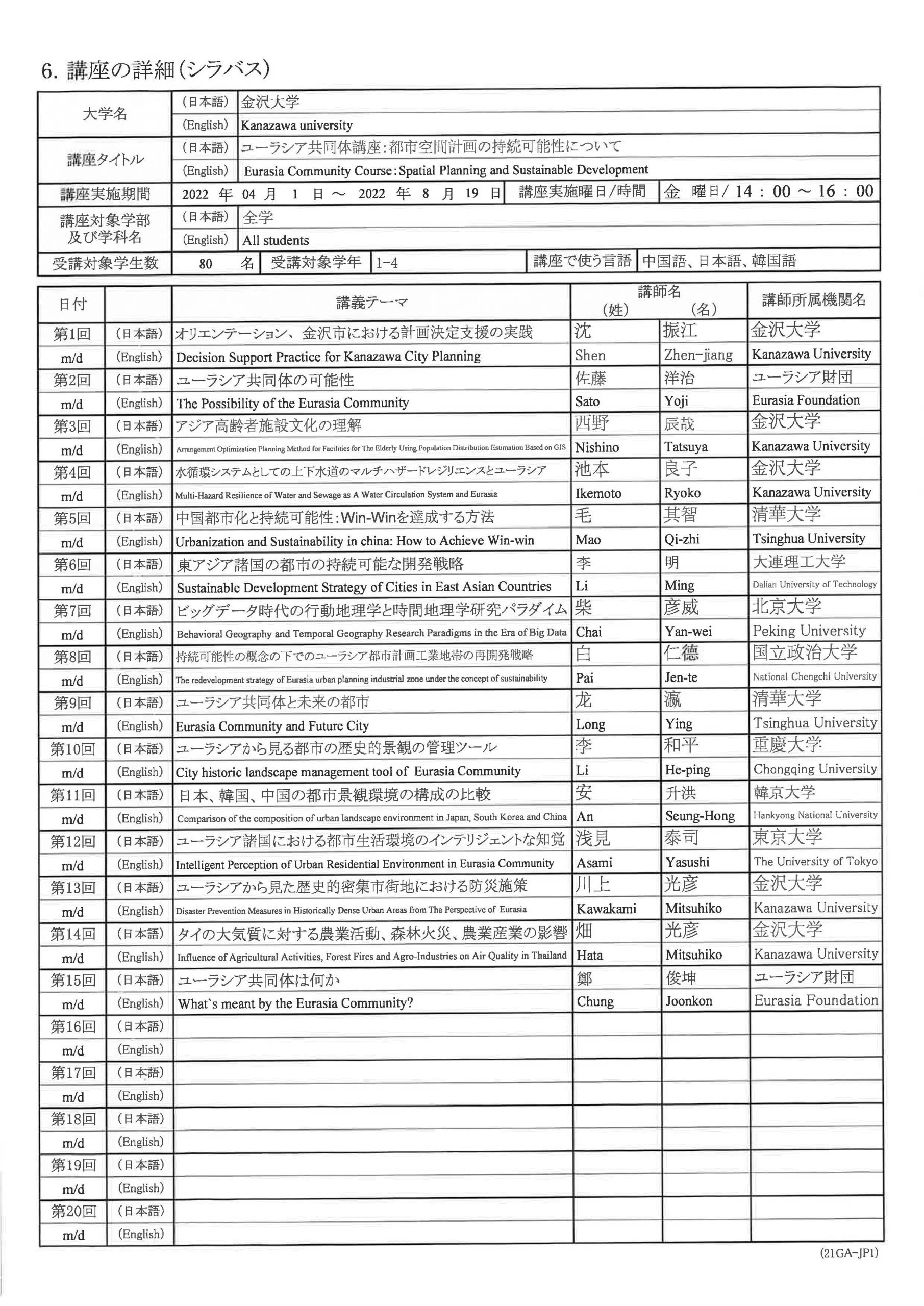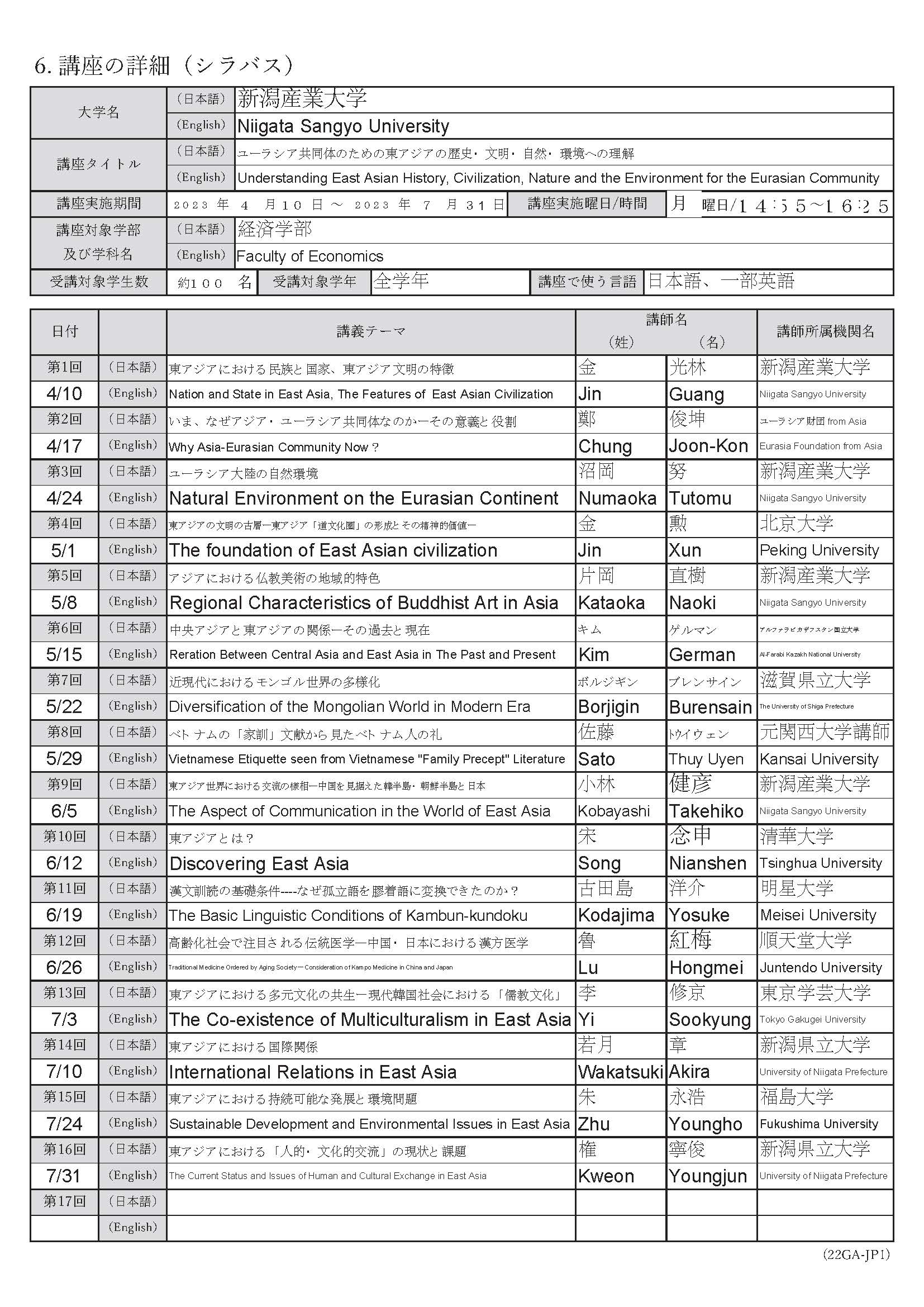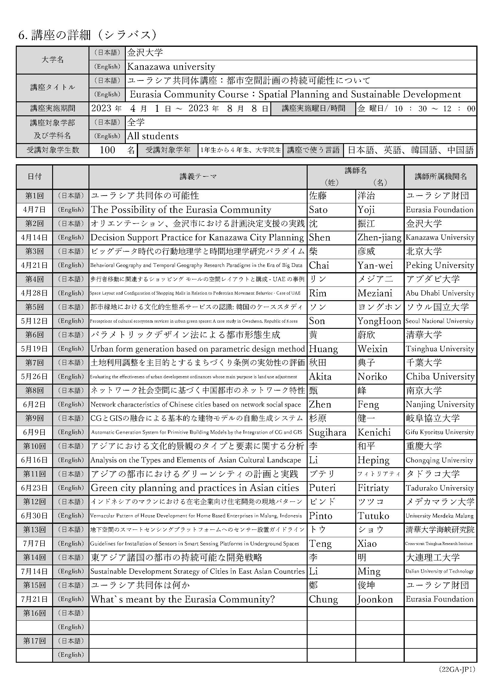 First year Apr. 2022 - Aug. 2021 ユーラシア共同体のための東アジアの歴史・文明・自然・環境への理解 Second year Apr. 2023 - Jul. 2023 Understanding East Asian History, Civilization, Nature and the Environment for the Eurasian Community Third year Apr. 2024 - Jul. 2024 East Asia Understanding Course: History, Civilization, Nature, Environment - Kanazawa University(Ishikawa)