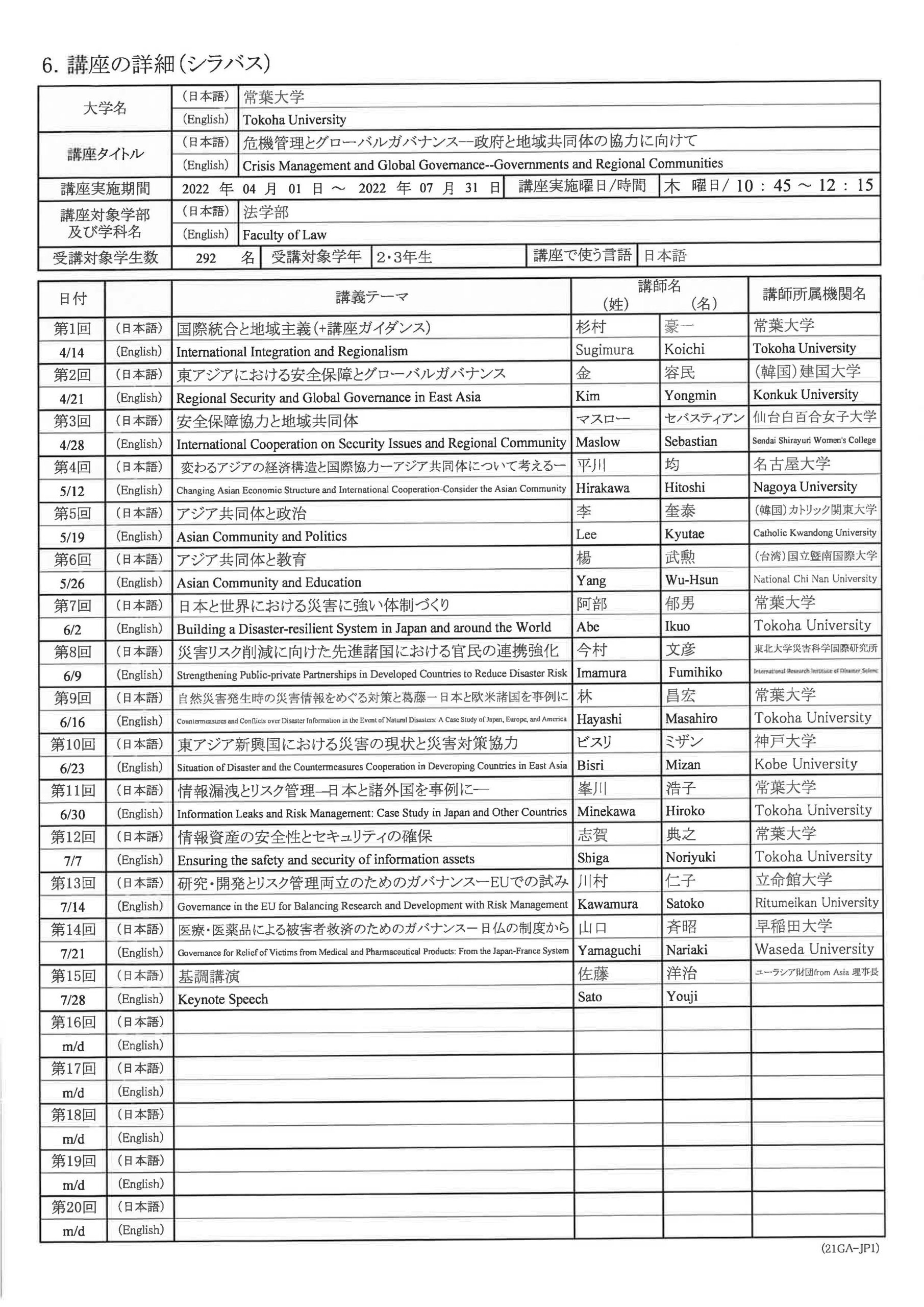 First year Apr. 2022 - Jul. 2022 Crisis management and Global Governance-Governments and Regional Communities - Kanagawa University(Kanagawa)