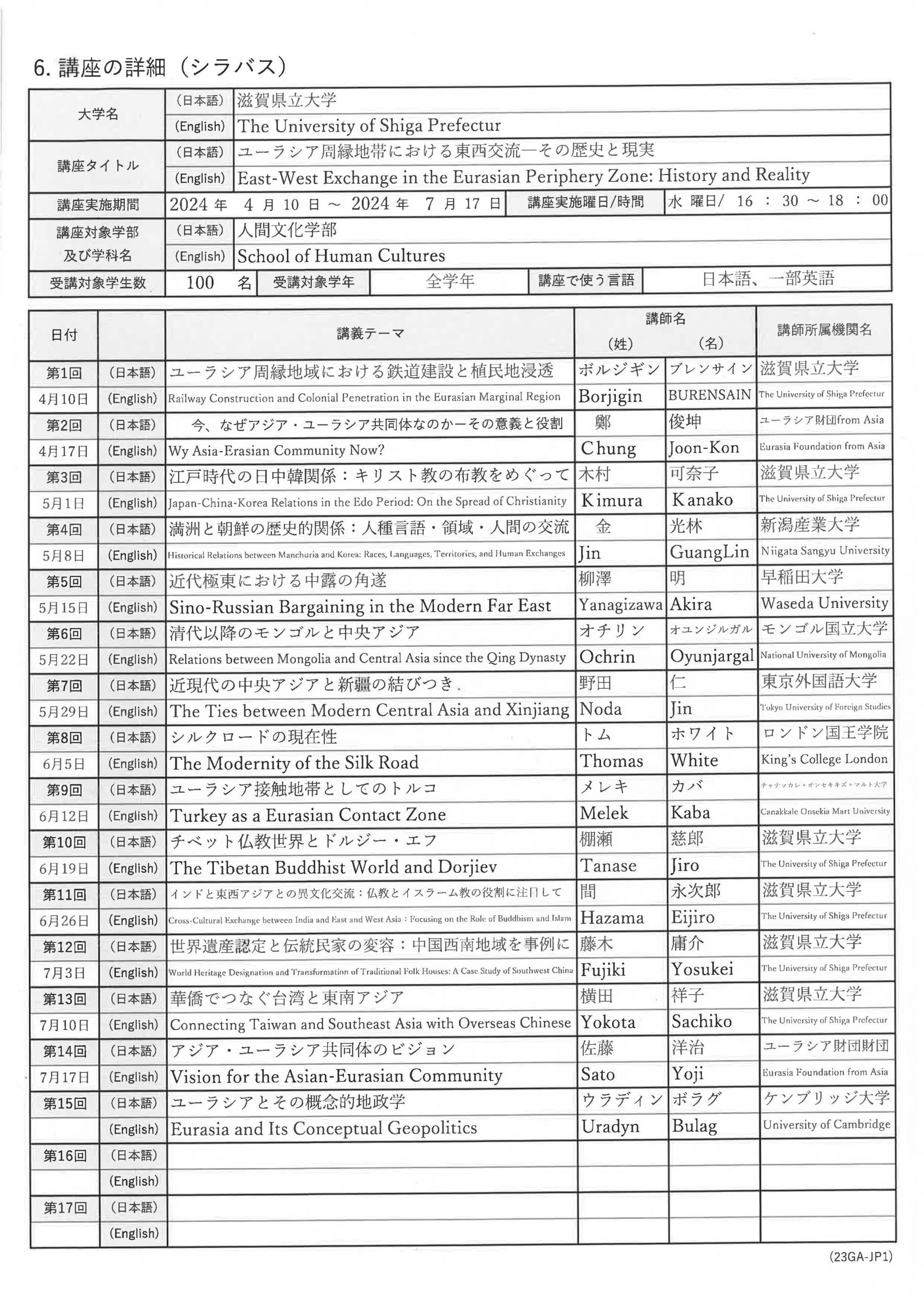 First year Apr. 2024 - Jul. 2024 East-West Exchange in the Eurasian Periphery Zone: History and Reality Second year Apr. 2025 - Jul. 2025 East-West Exchange in the Eurasian Periphery Zone: History and Reality