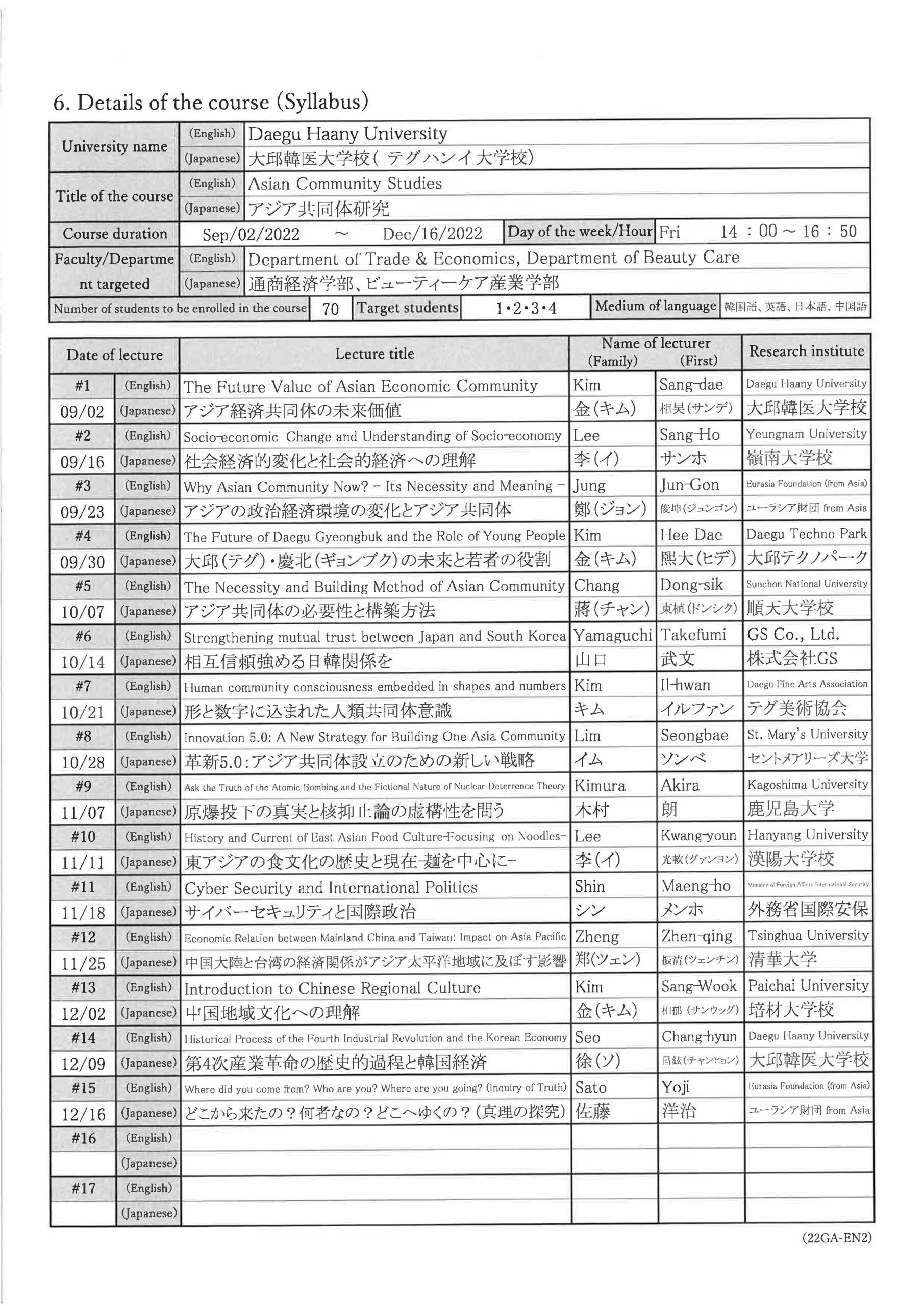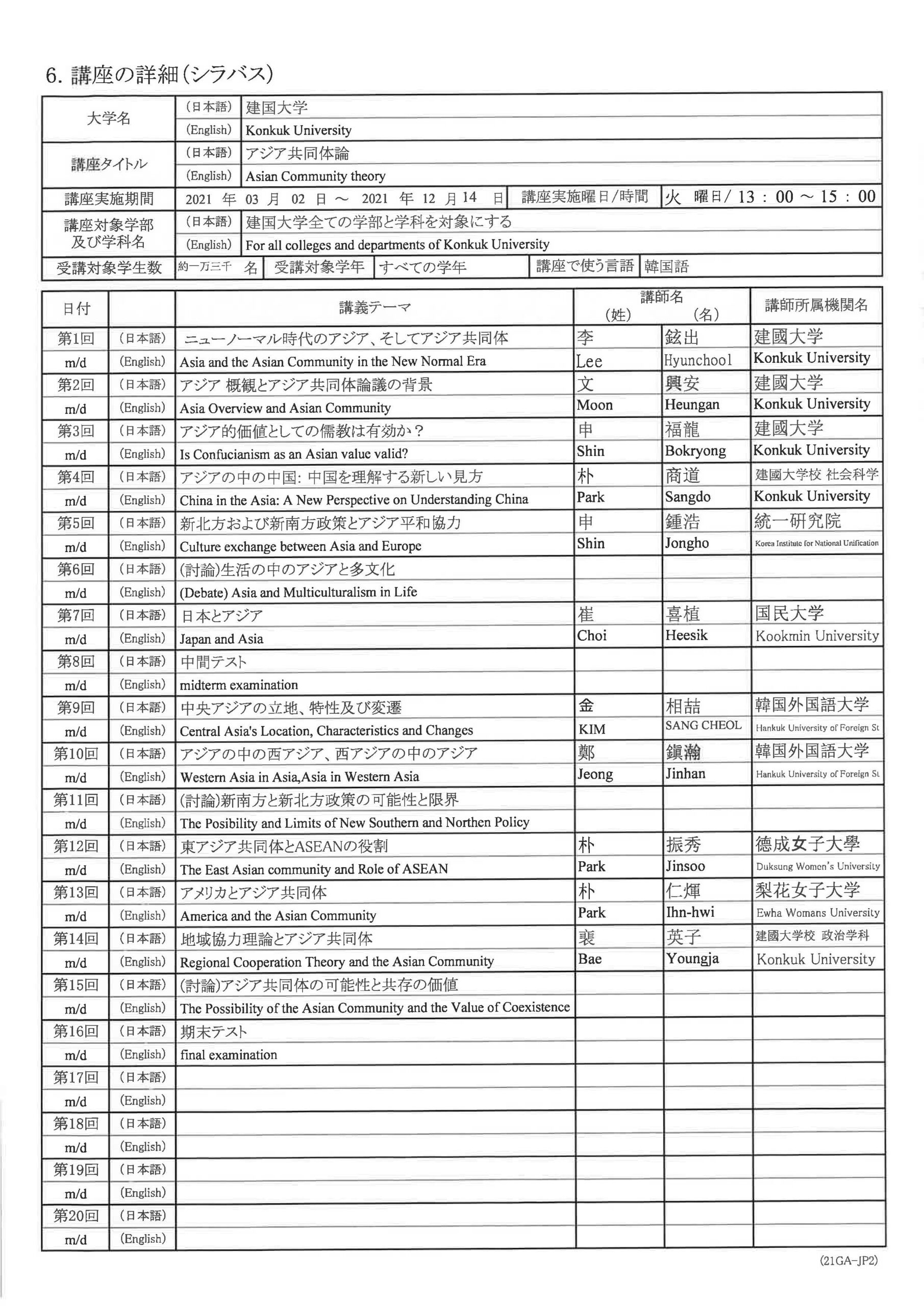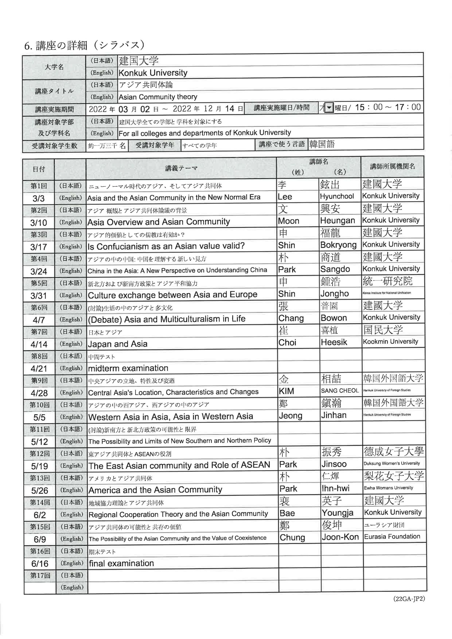 First year Sep. 2022 - Dec. 2022 Understanding of the Asian Community : Asian Youth Politics and Popular Culture Second year Sep. 2023 - Dec. 2023 Understanding of the Asian Community: Asian Youth Politics and Popular Culture Third year Mar. 2025 - Jun. 2025 Understanding of the Asian Community: Asian Youth Politics and Popular Culture Fourth year Mar. 2026 - Jun. 2026 Understanding of the Asian Community: Asian Youth Politics and Popular Culture - Kongju National University(Gongju)