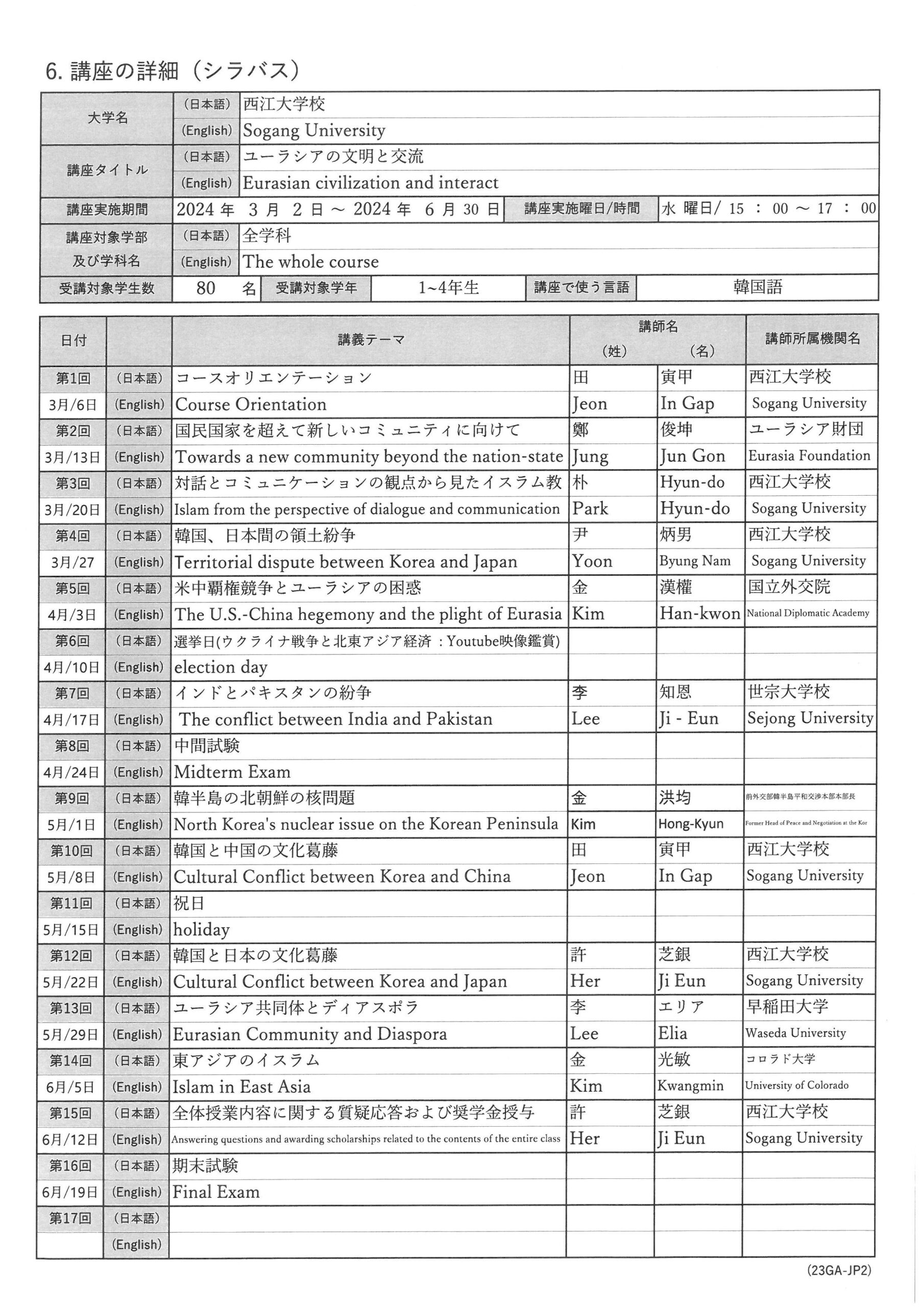 First year Mar. 2023 - Jun. 2023 Eurasian Culture and Education Community Second year Mar. 2024 - Jun. 2024 Eurasian Culture and Education Community II Third year Mar. 2025 - Jun. 2025 Eurasian Community Theory Fourth year Mar. 2026 - Jun. 2026 Eurasian Community Theory - Yong In University(Yongin)